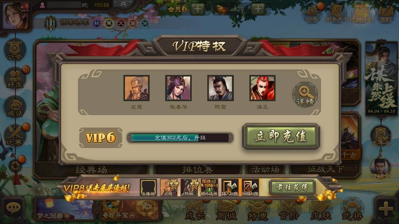 官阶:领军将军;VIP等级:VIP6;史诗武将数量:8;动态皮肤数量:8;武将