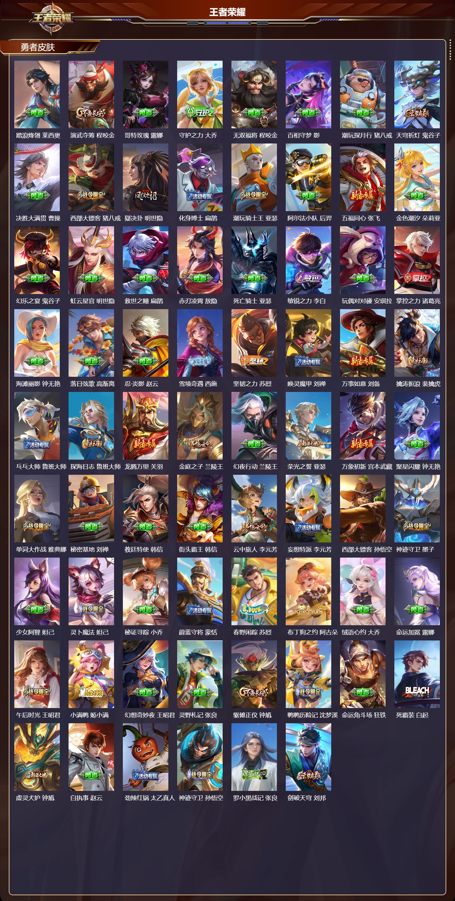 荣耀王者/268皮肤/128英雄/2典藏/0珍品无双/0无双/0珍品传说/11传说/94史诗/9稀有英雄