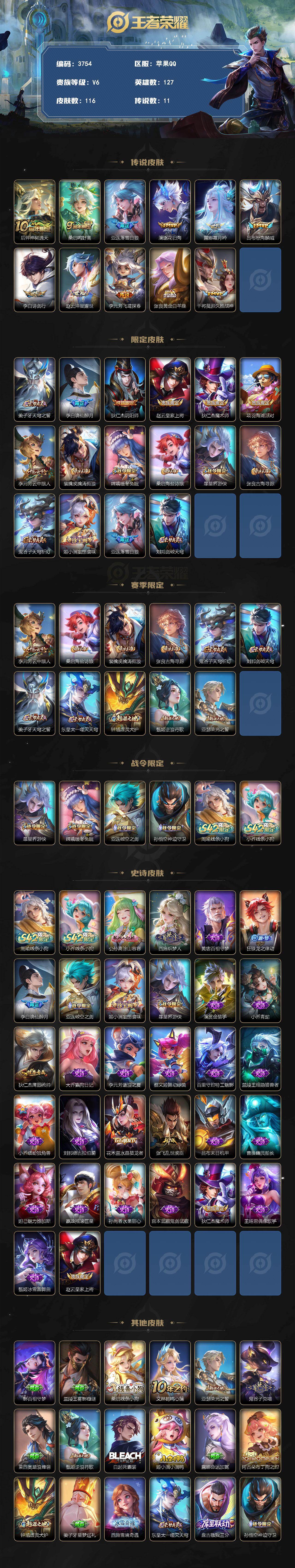 【3754】【V6对抗路男神号·11传说·116皮肤·低价出】苹果Q-V6-永恒钻石II段位-127英雄-116皮肤-11传说-31史诗