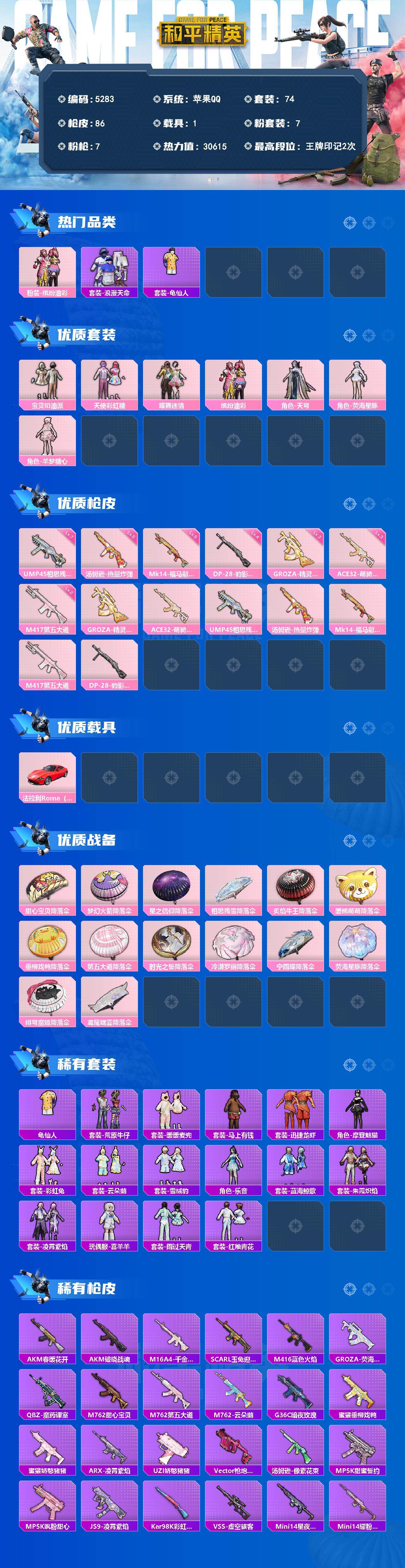 粉装7/粉枪7/载具1/套装74/枪皮86/热力值30615/历史最高段位:王牌印记2次/Lv:48/三级GROZA-精灵之光/三级ACE32-萌骑漫游/七级UMP45-相思残雪/五级汤姆逊-热量炸弹/五级Mk14-福马献瑞/二级M417-第五大道/四级DP-28-豹影疾电/粉装-缤纷油彩/套装-浪漫天命/套装-龟仙人/宝贝奶油派/天使彩虹糖/蝶舞迷情/缤纷油彩/角色-天穹/角色-荧海星豚/角