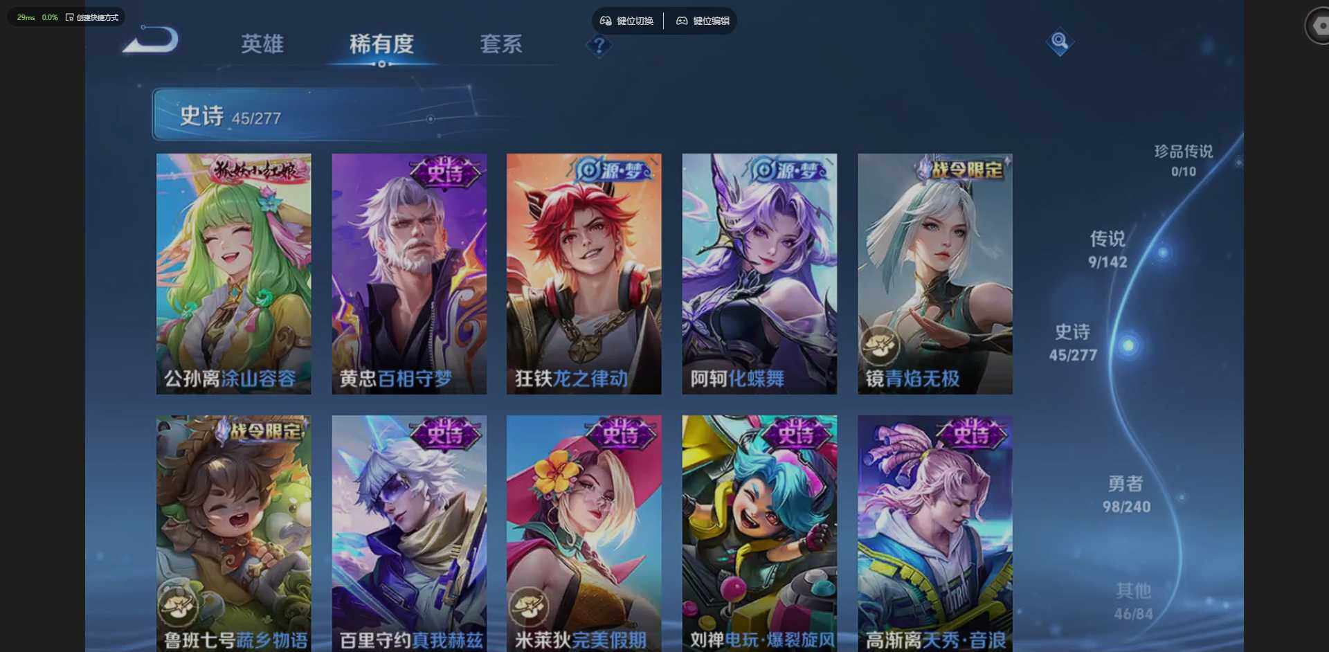 47/实名: 可修改 贵族等级: V8 英雄数: 128 皮肤数: 199 荣耀水晶: 全息碎影 传说皮: 一念神魔,时之恋人-刘备,灼幽烈阳,乘龙·问璇玑,乘龙·铭钟鼎,乘龙·淬吴钩 限定皮: 遇见飞天,李小龙,逐梦之影,高山流水,孙行者,猪悟能,无尽星芒,鸣野蒿