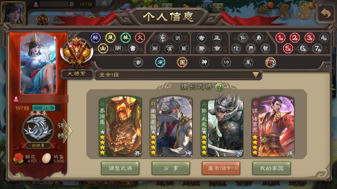 官阶:大将军;VIP等级:VIP9;史诗武将数量:38;动态皮肤数量:24;武