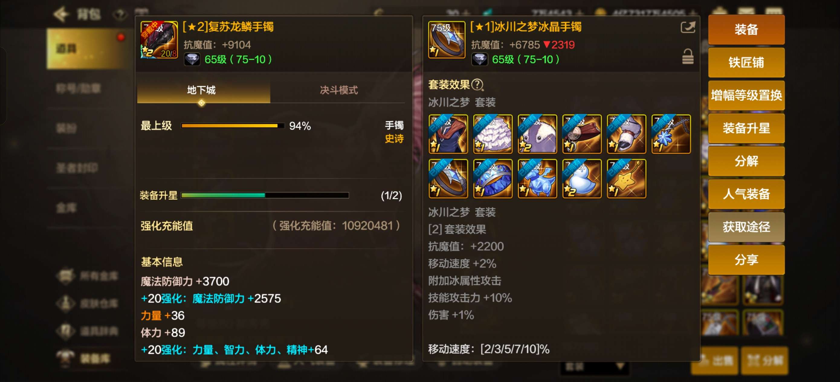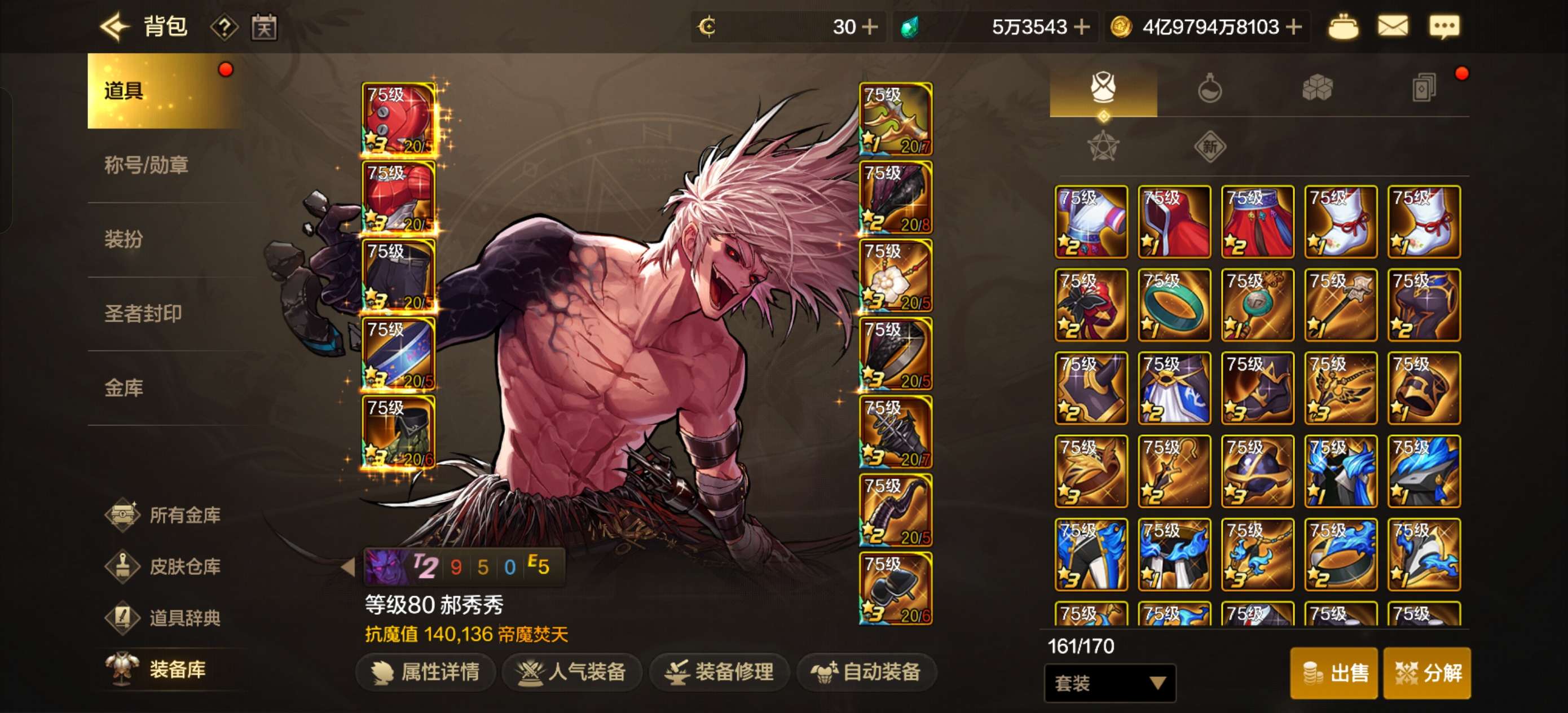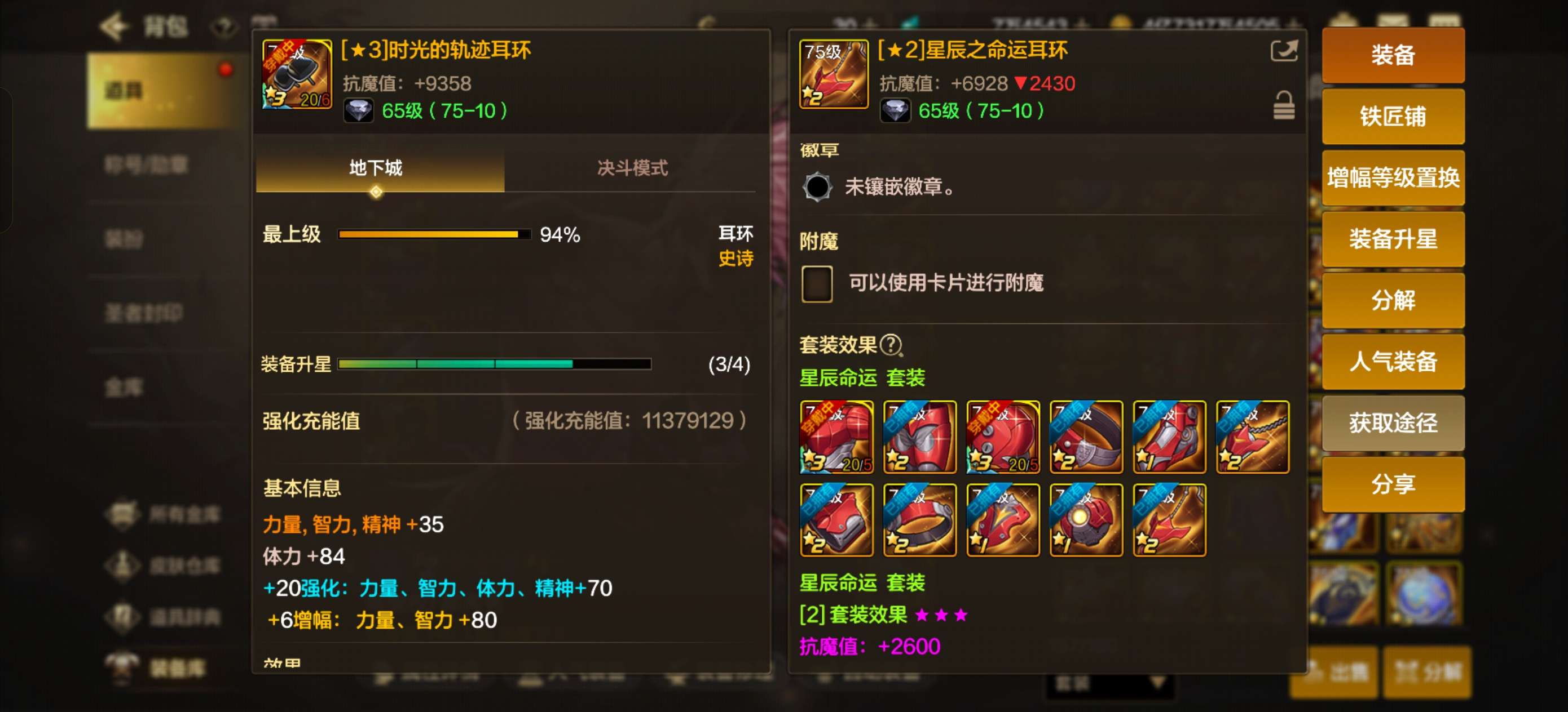 全身20+,抗魔14+w 天空一套,75级史诗套,几乎全部齐了,