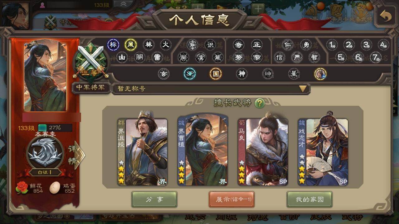 官阶:中军将军;VIP等级:VIP3;史诗武将数量:7;动态皮肤数量:1;武将
