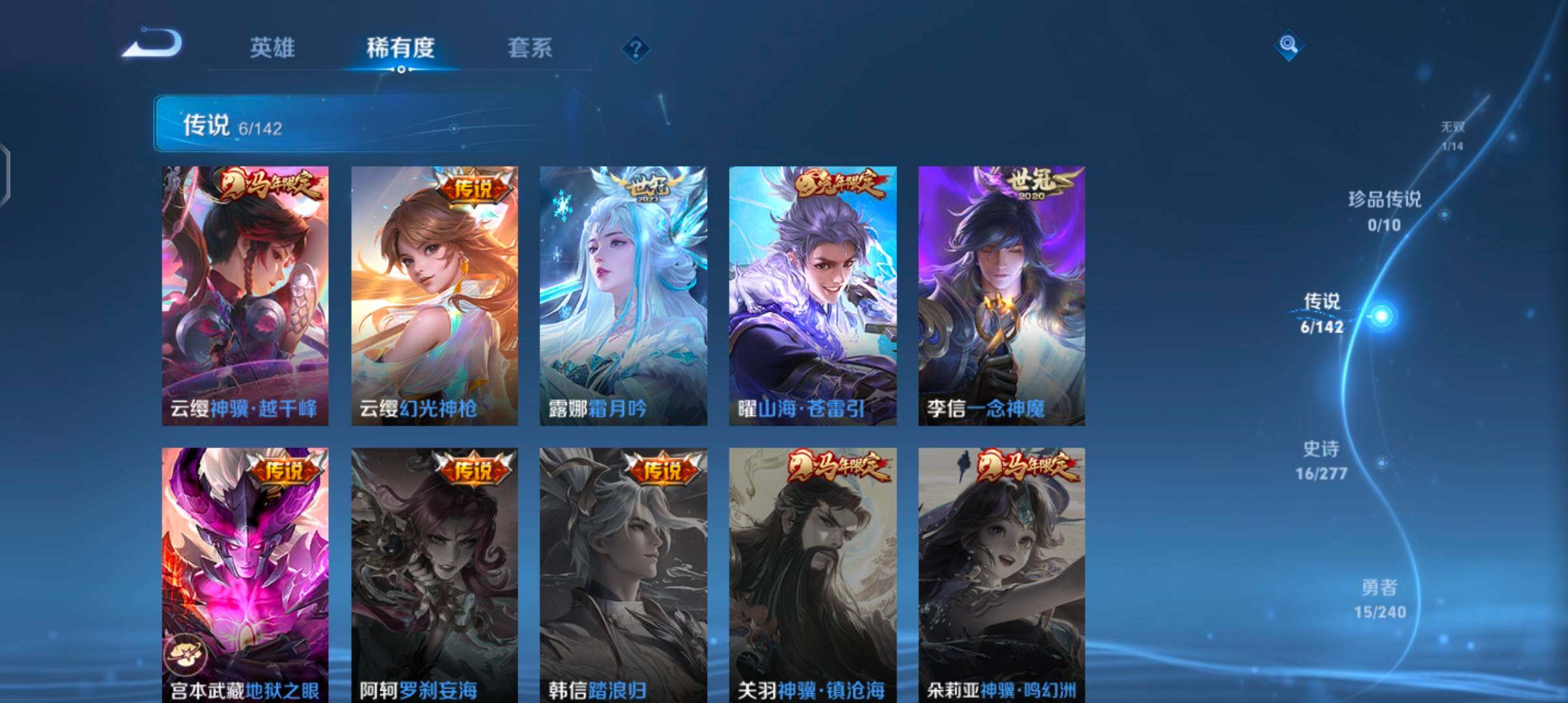 【传说皮肤】:云缨神骥越千峰,云缨幻光神枪,露娜霜月吟,曜山海苍雷引,李信一念神魔,宫本武藏地狱之眼