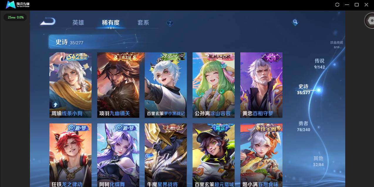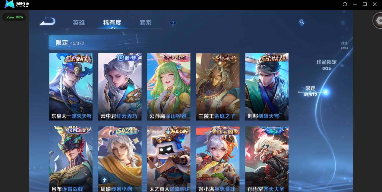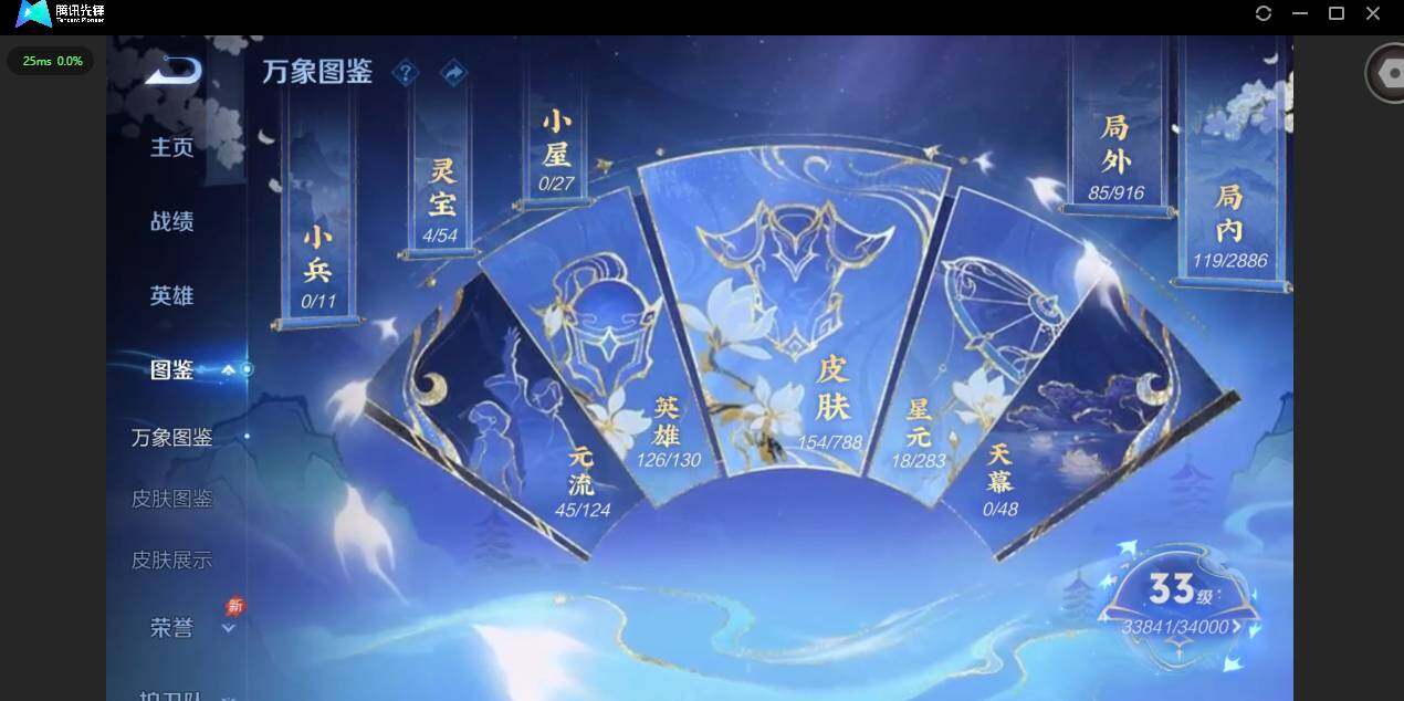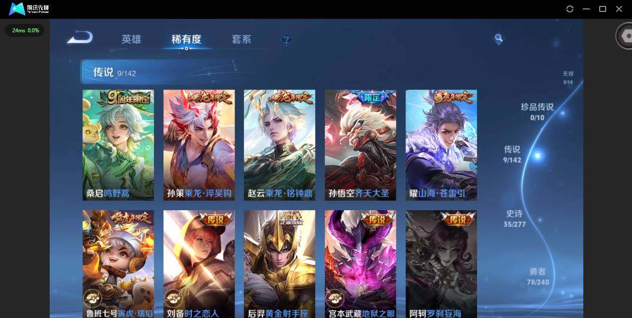 6/实名: 可修改 贵族等级: V6 英雄数: 126 皮肤数: 154 星传说: 幽冥之眼 传说皮: 黄金射手座,地狱之眼,时之恋人-刘备,山海·苍雷引,乘龙·铭钟鼎,乘龙·淬吴钩 限定皮: 寅虎·瑞焰,齐天大圣,鸣野蒿,逐霄战戟