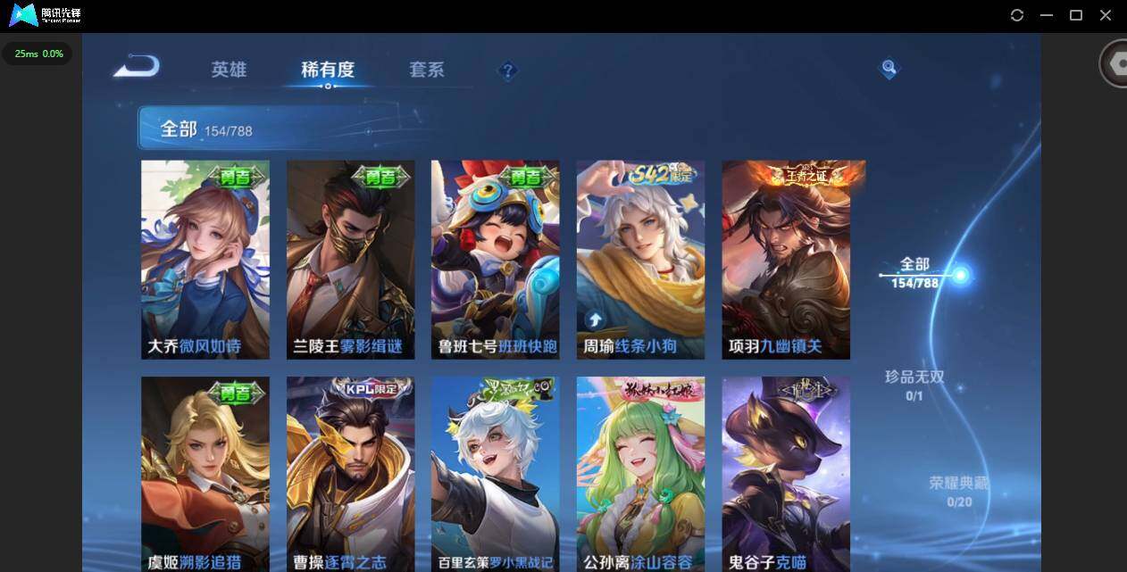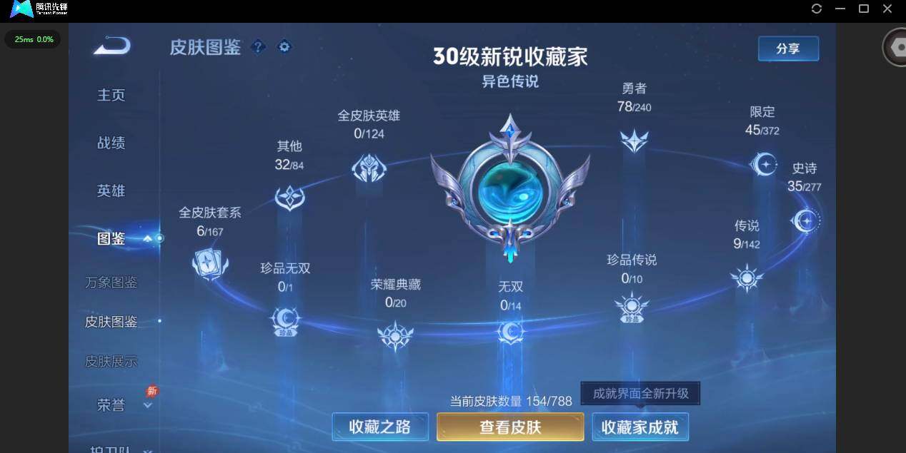 实名: 可修改 贵族等级: V6 英雄数: 126 皮肤数: 154 星传说: