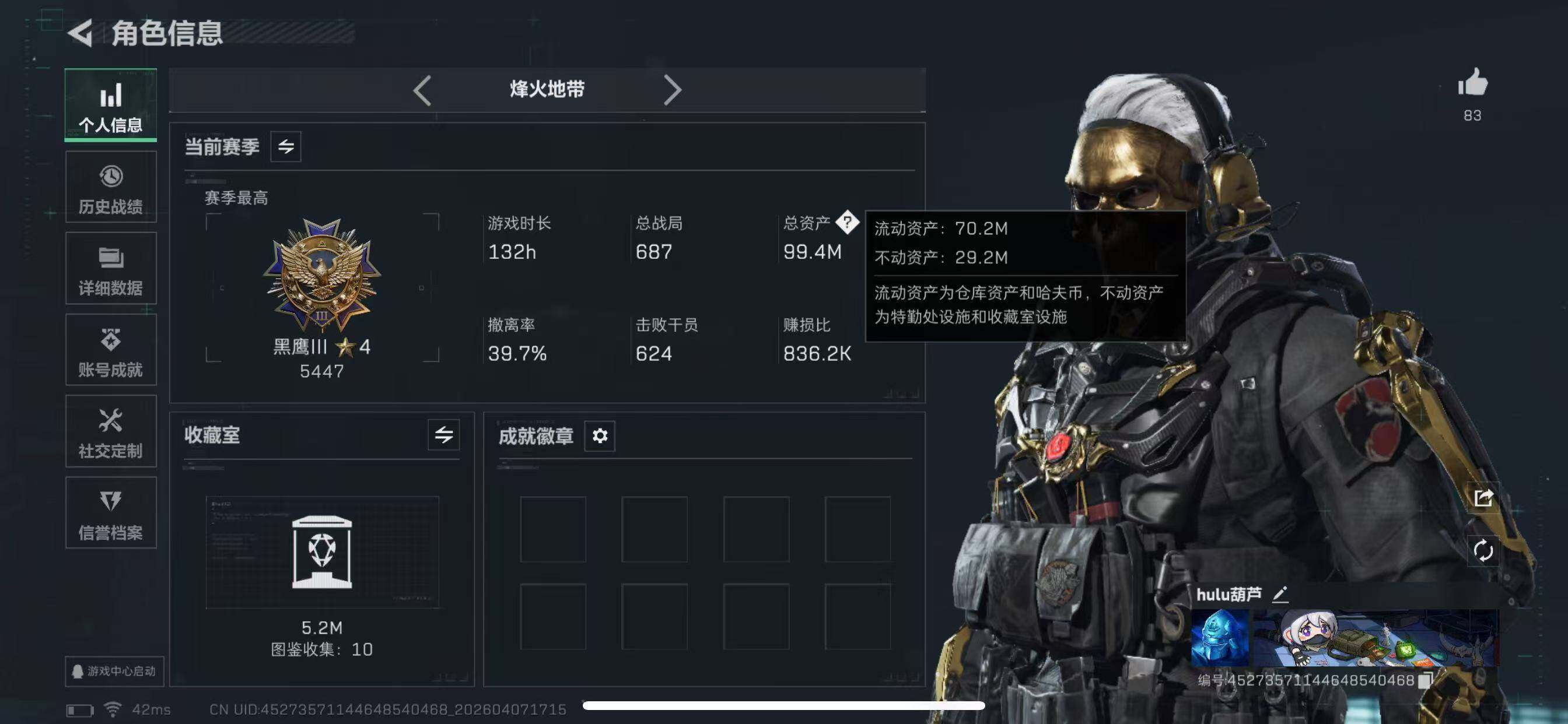 99m总资产-10360k哈夫币-60烽火等级-黑鹰-50战场等级-军士长