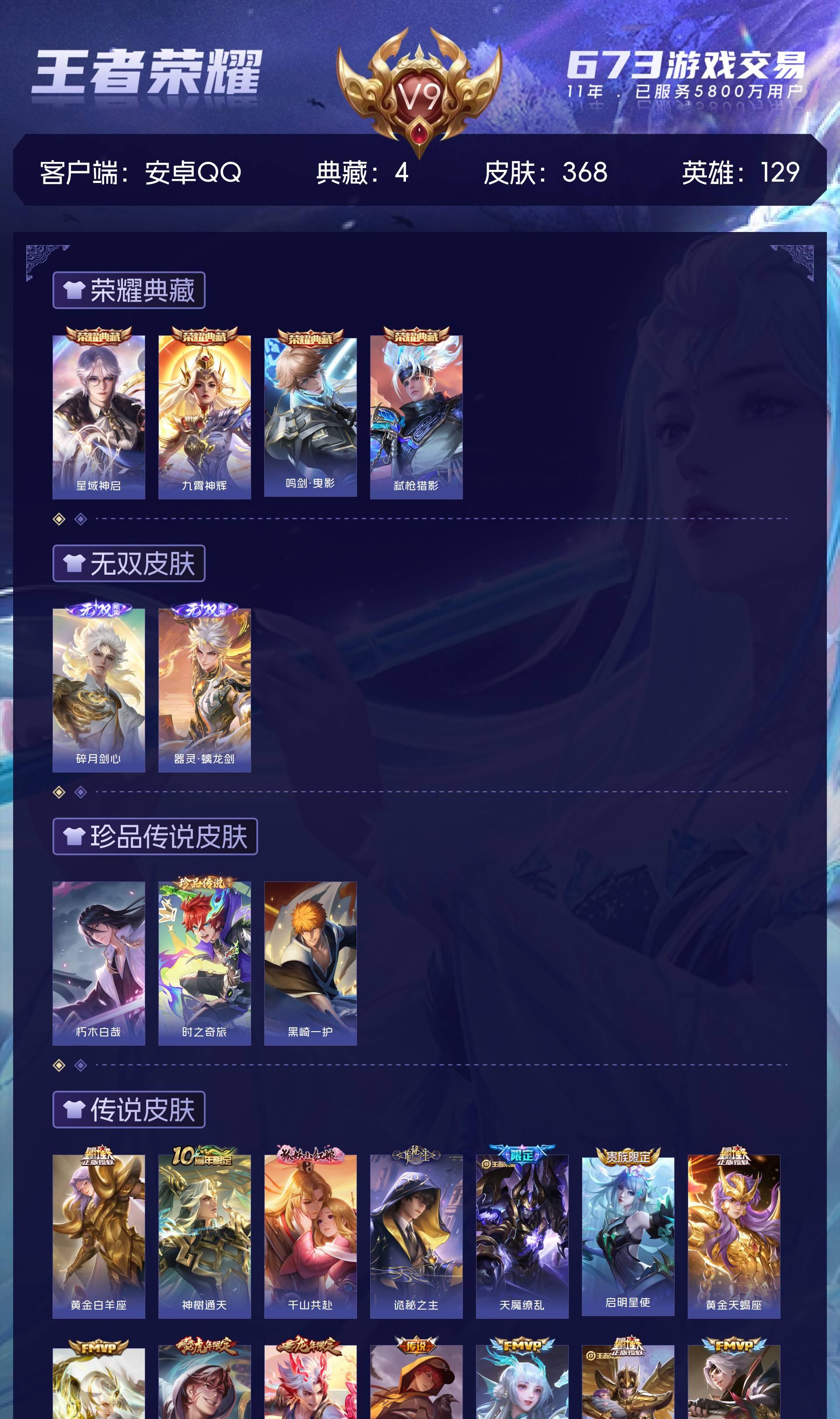 V9 皮肤368 英雄129 至尊星耀 荣耀典藏4 无双皮肤2 珍品传说3 星传说3 传说42