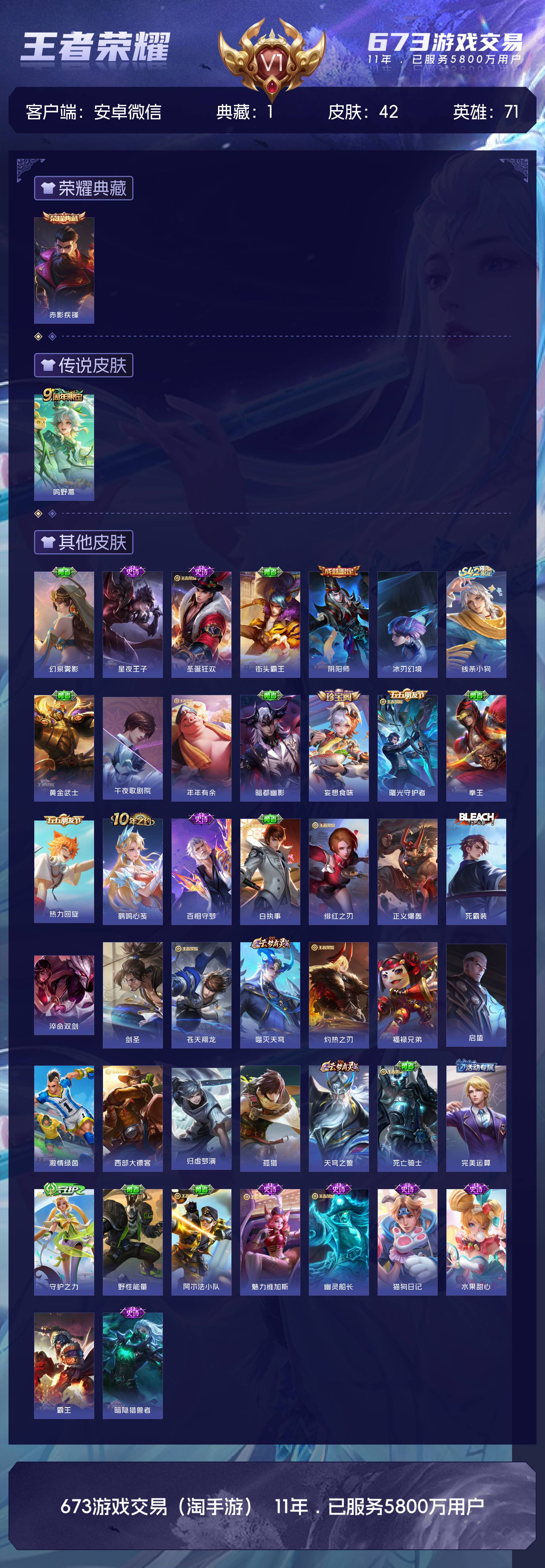 V1 皮肤42 英雄71 尊贵铂金 荣耀典藏1 传说1