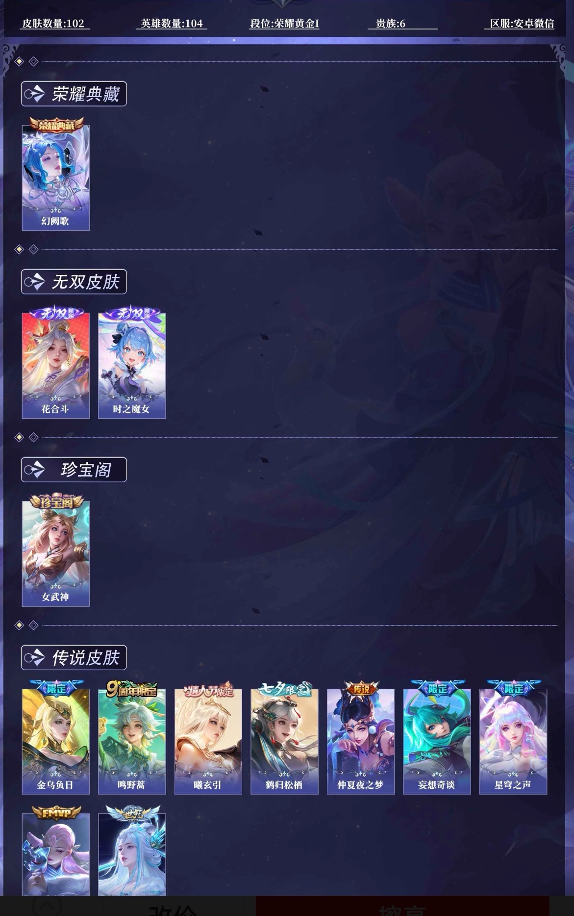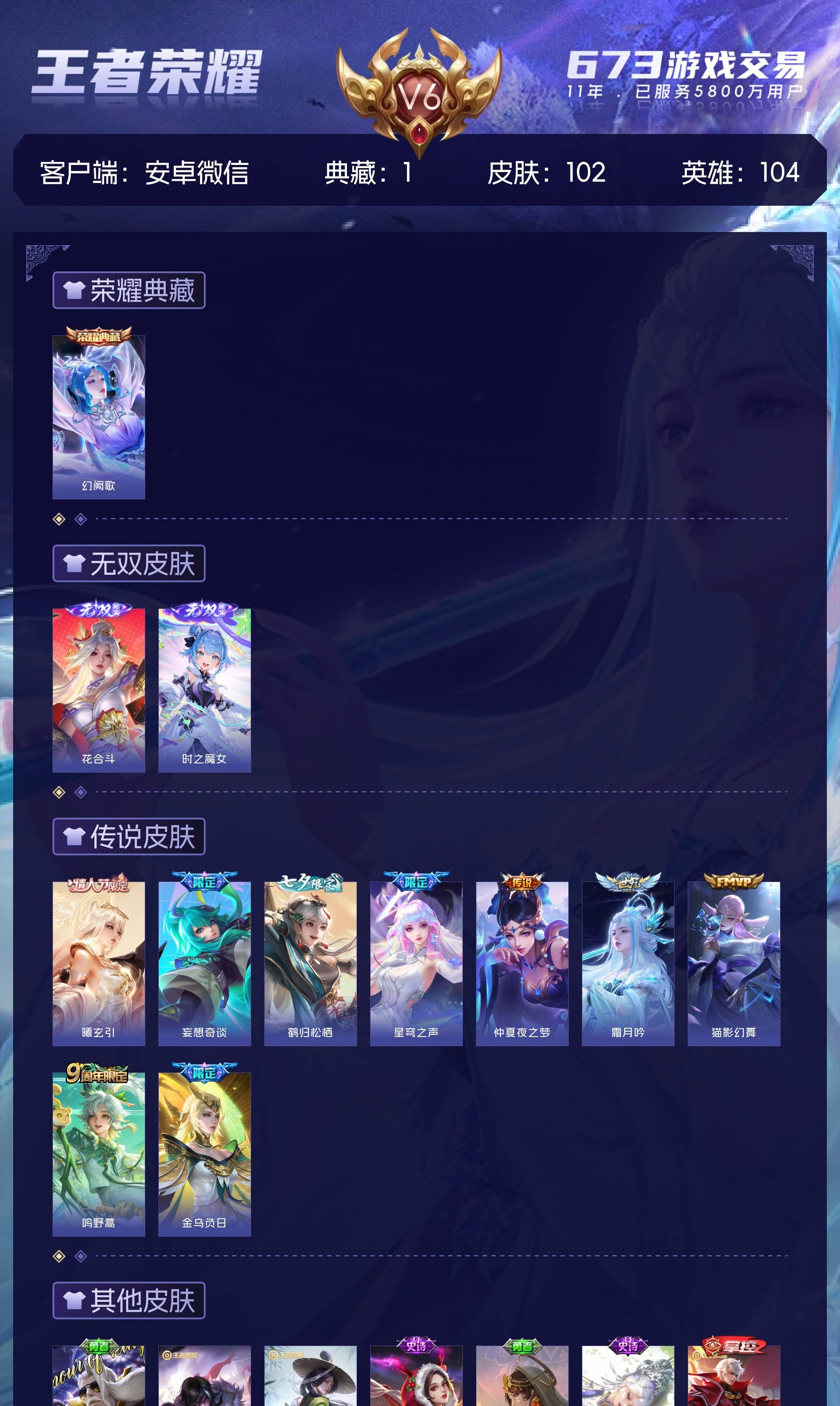 V6 皮肤102 英雄104 荣耀黄金 荣耀典藏1 无双皮肤2 传说9