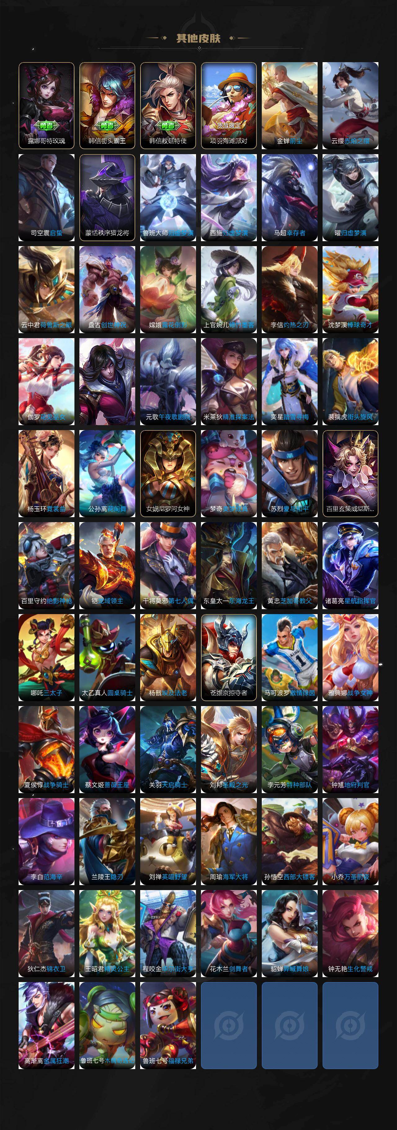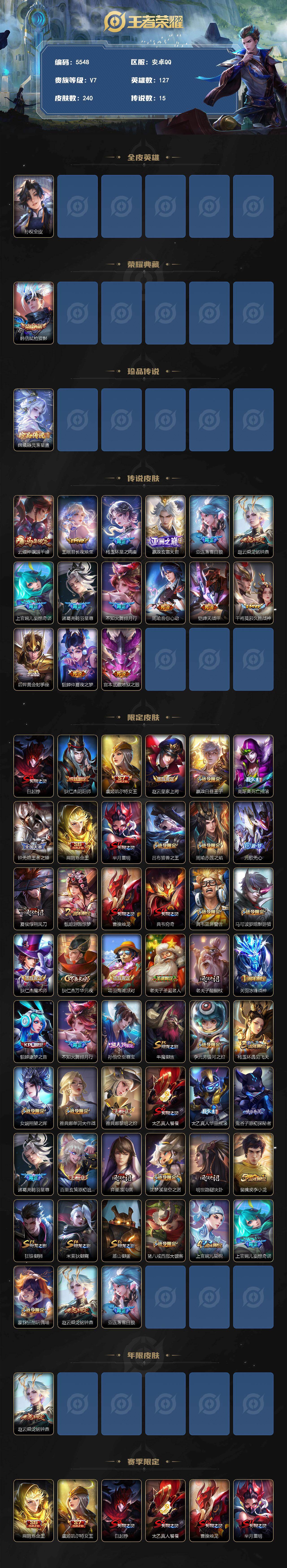 贵族等级7/荣耀典藏数量1/传说皮肤数量15/史诗皮肤数量51/皮肤数量240/英雄数量127/段位至尊星耀/孙权全皮/弑枪猎影 韩信/器灵·落星盏 嫦娥/云缨神骥越千峰/王昭君长夜焕生/星之鸣奏 杨玉环/玄雷天君 嬴政/落雪白狼 亚连/乘龙·铭钟鼎 赵云/妄想奇谈 上官婉儿/鹤羽星尊 诸葛亮/绯月行 不知火舞/音你心动 周瑜/绛天战甲 铠/久胜战神 干将莫邪/黄金射手座 后羿/仲夏夜之梦 貂