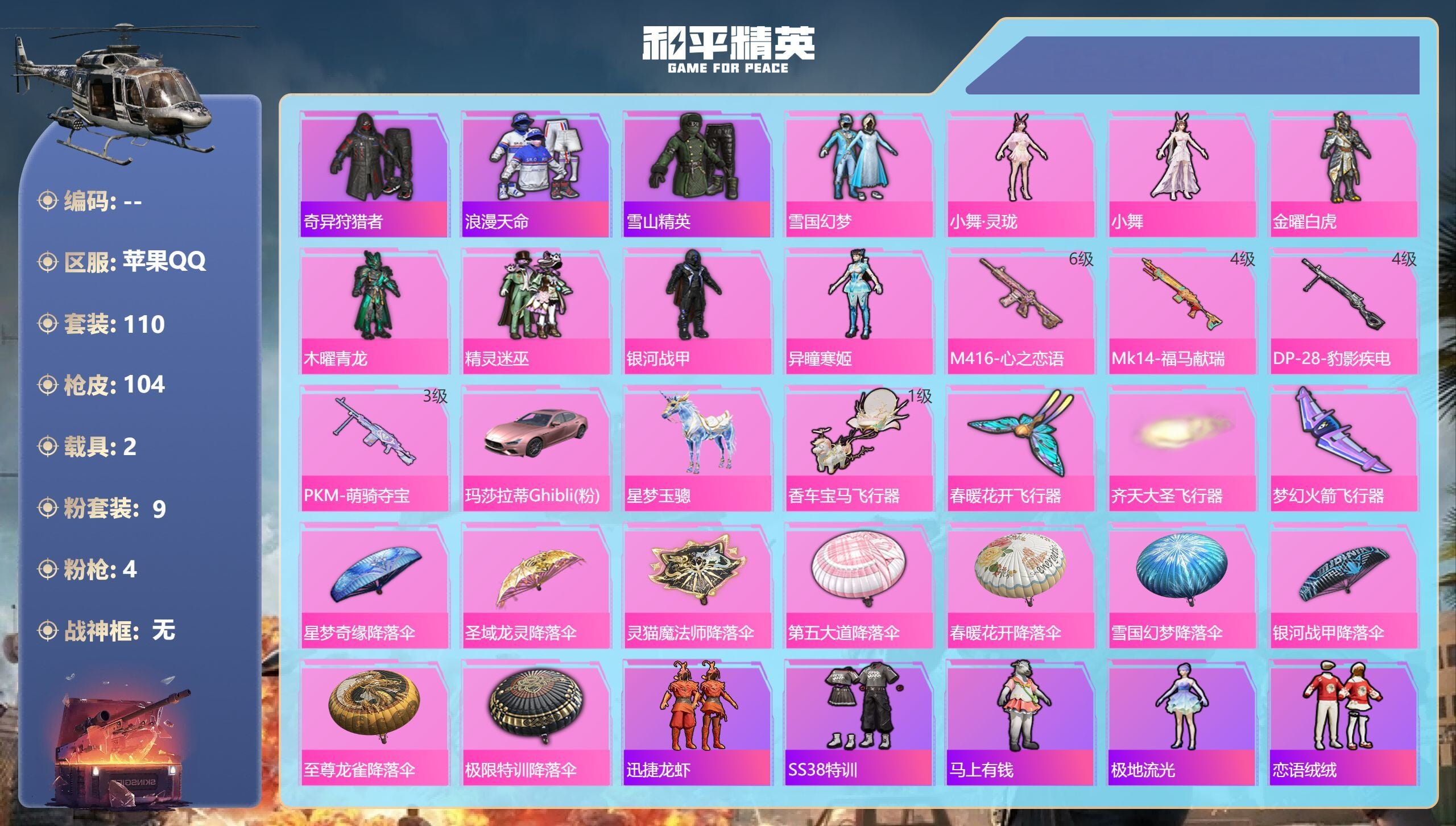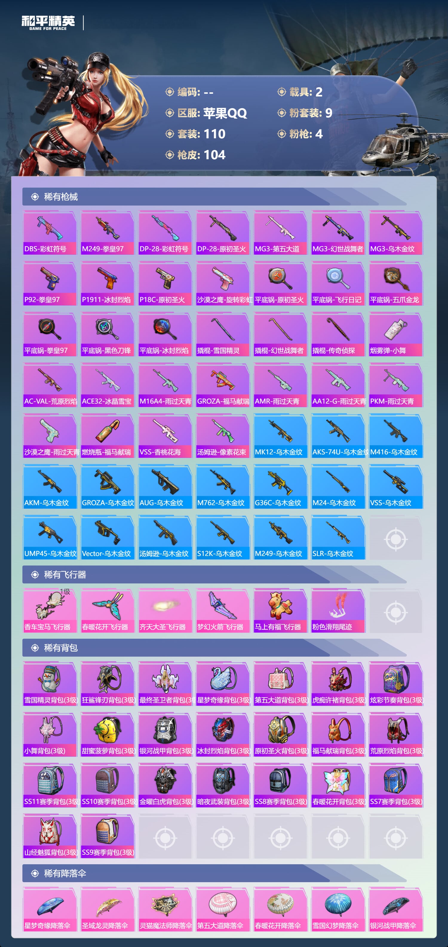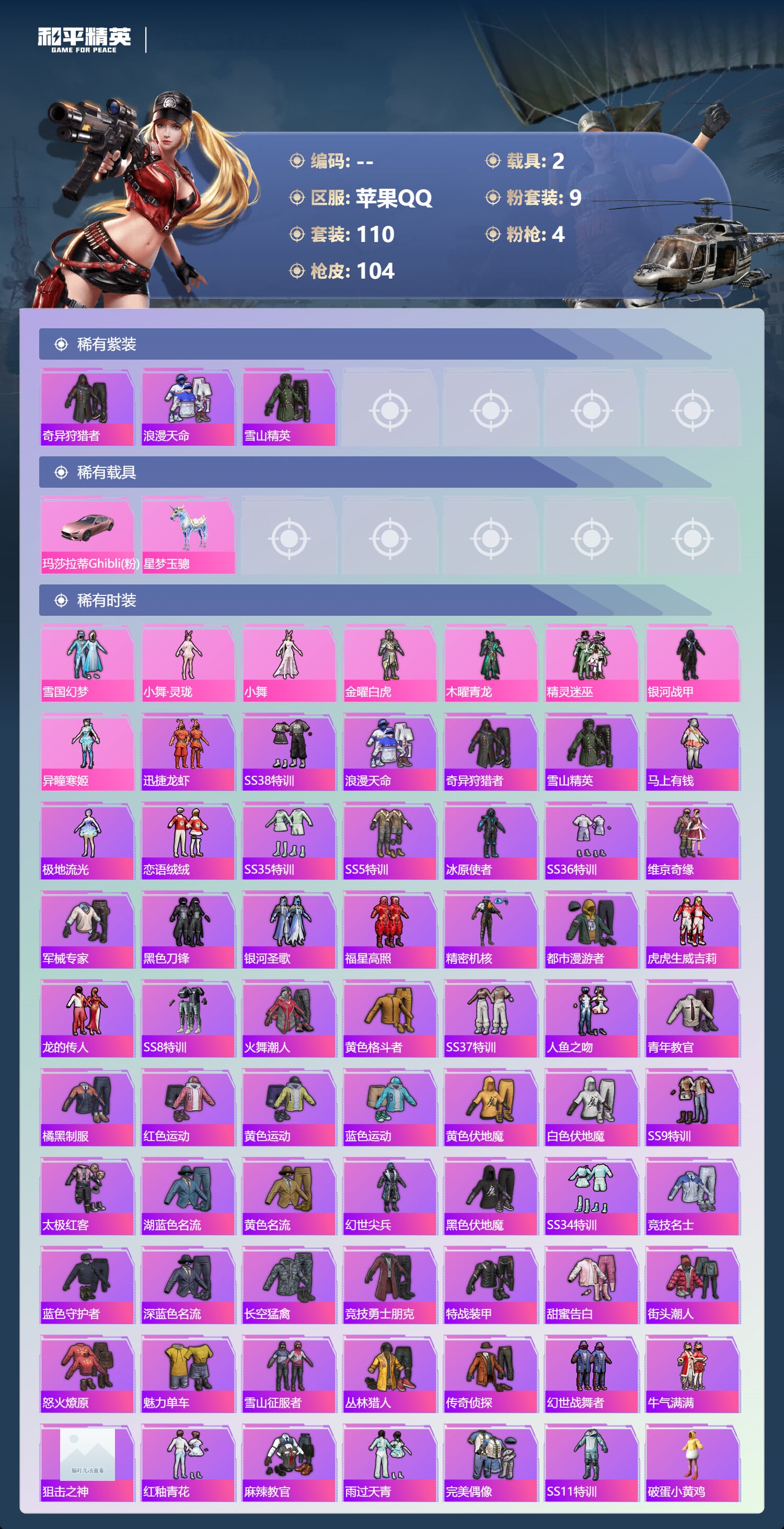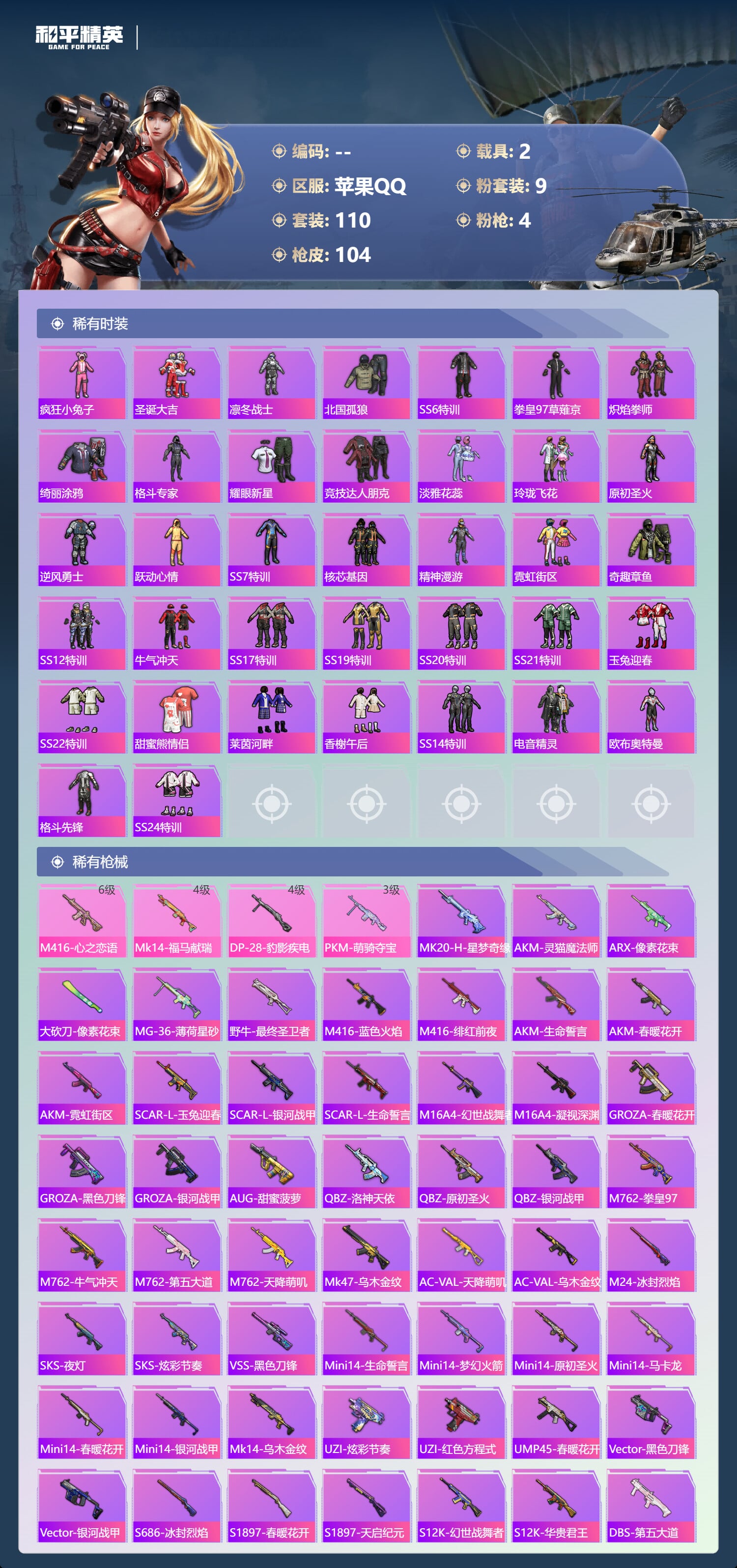 a4360/苹果QQ/2王牌印记-9粉装-4特效枪-2载具-42806热力值-110套装-104枪皮