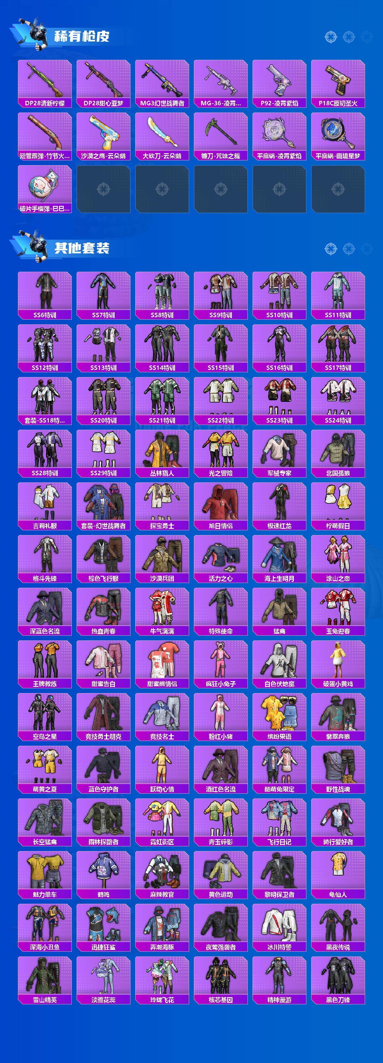 【粉色枪皮等级】:M416-心之恋语(七级),GROZA-镜光银凌(五级),AUG-暖羊咩咩(五级),M762-激战未来(七级),汤姆逊-怪笑疯兔(七级),Kar98K-巳巳如意(五级),DP-28-豹影疾电(五级),MG-36-沧焰双生(五级)