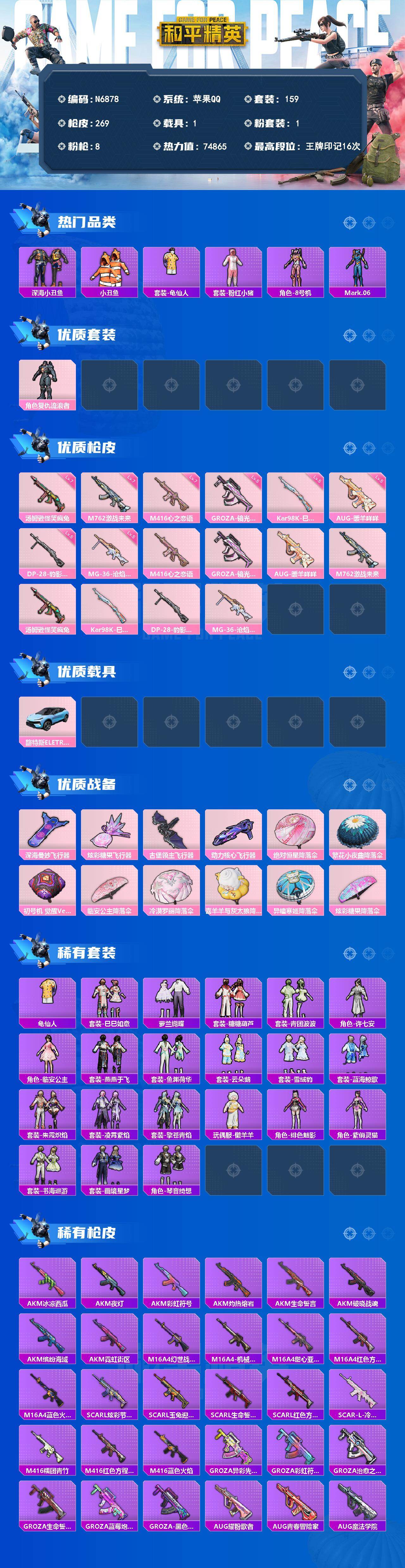 苹果 手Q-1粉装-8特效枪-1载具-4粉色飞行器-74865热力值-16王牌印记-159套装-269枪皮