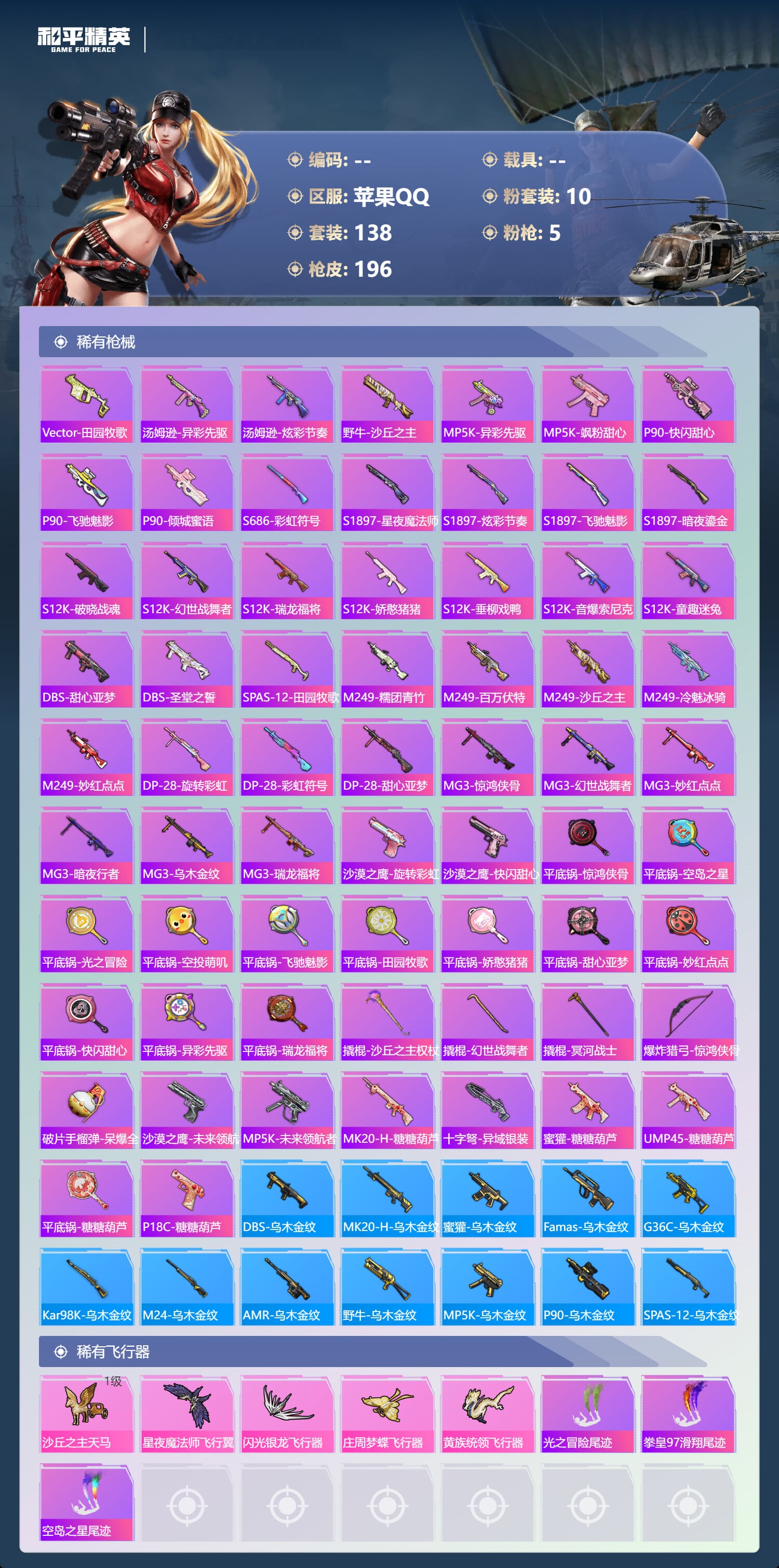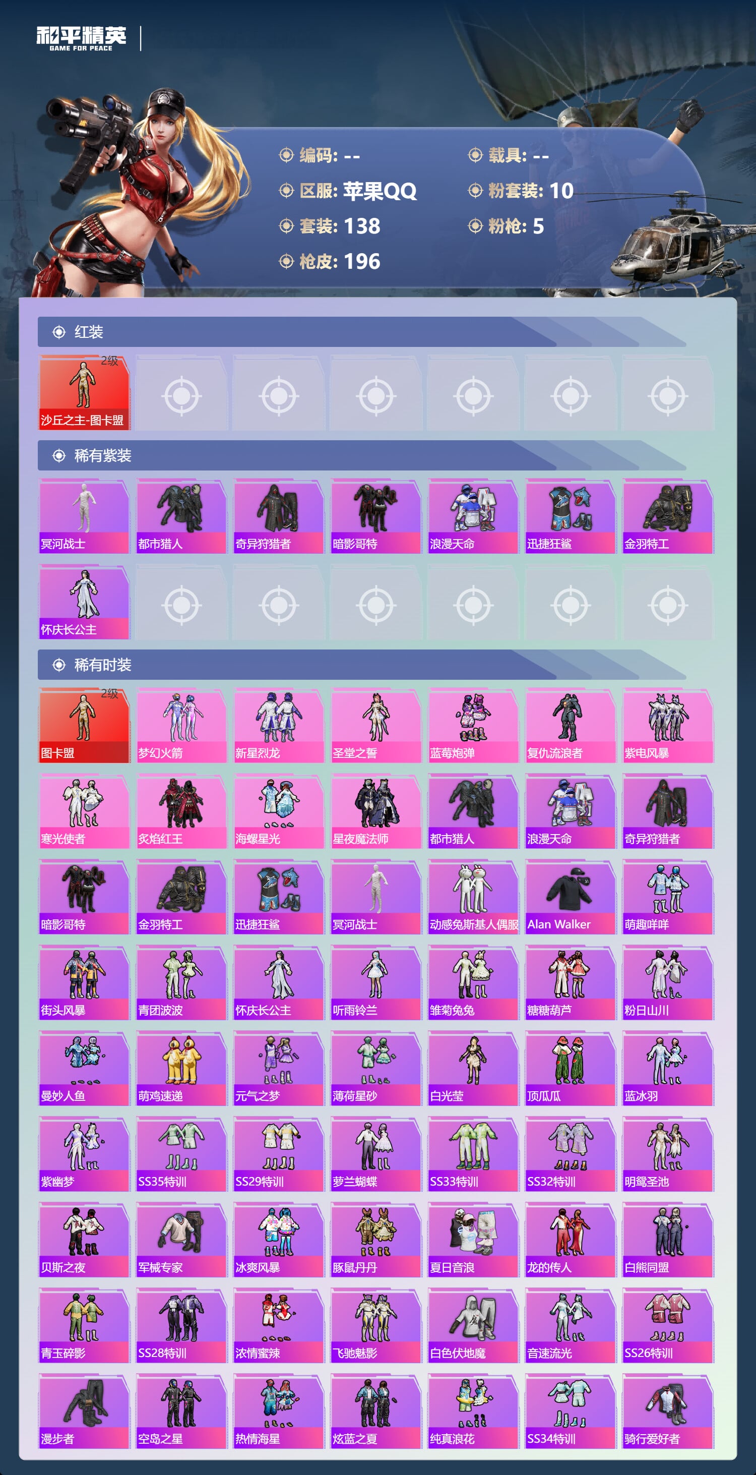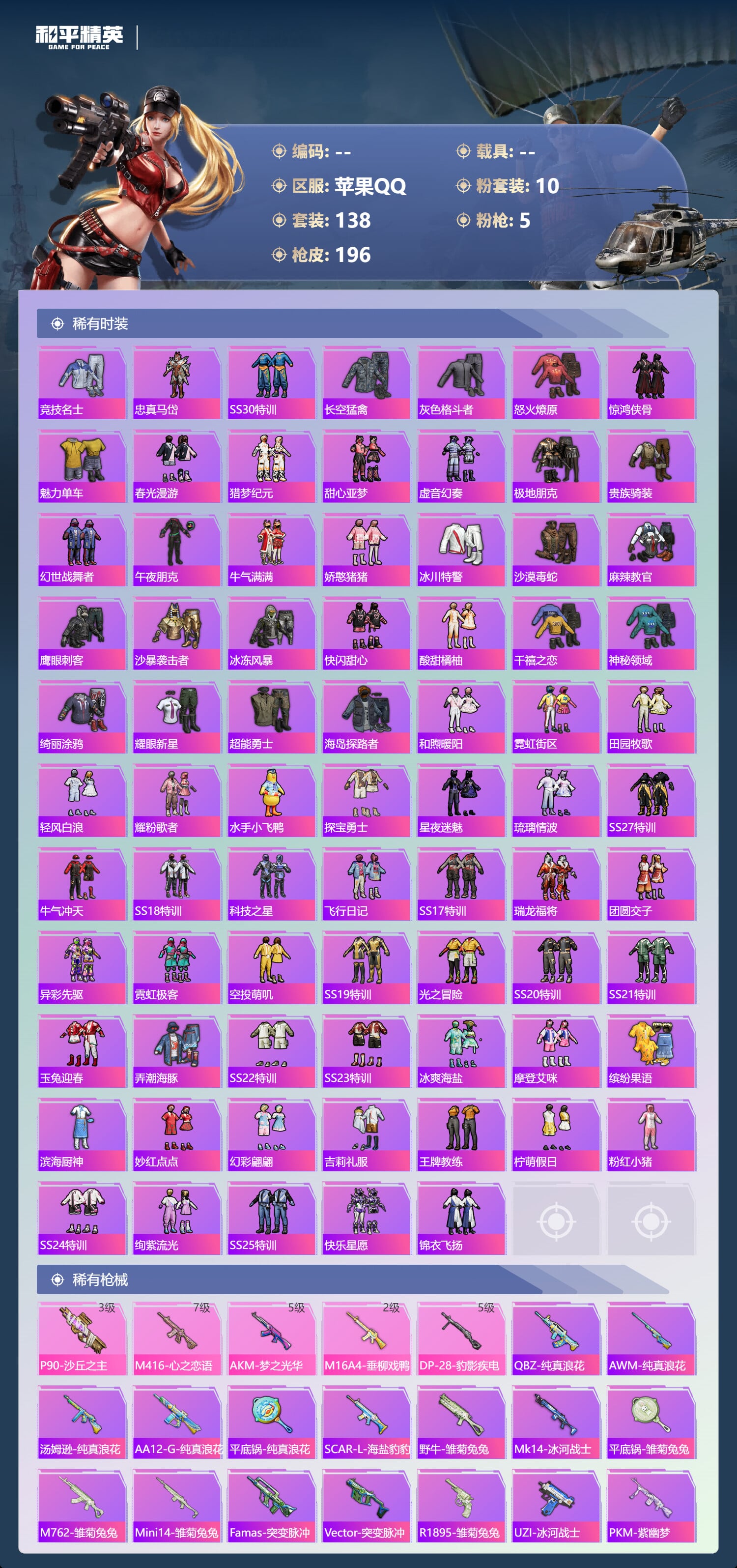a4350/苹果QQ/16王牌印记-1红装-10粉装-5特效枪-63390热力值-138套装-196