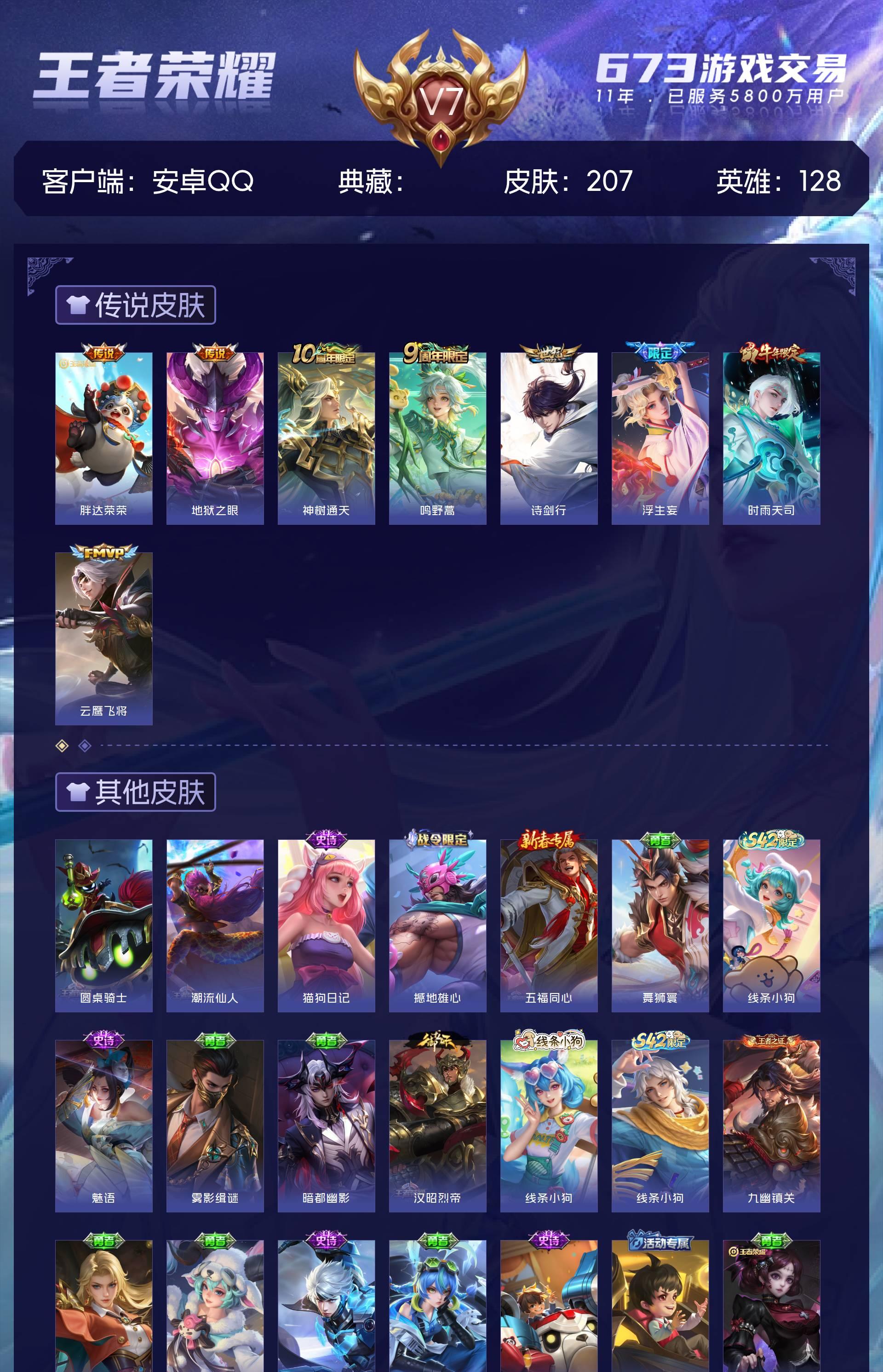 V7 皮肤207 英雄128 非凡王者 星传说1 传说9