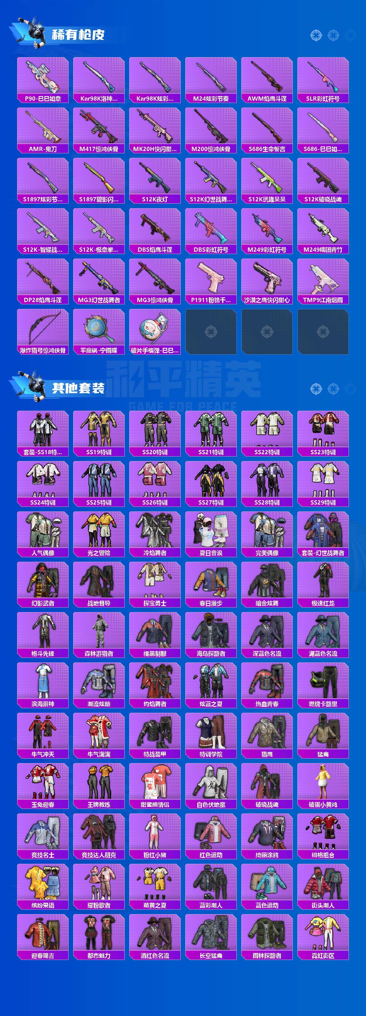 【粉色枪皮等级】:AKM-绿萝繁花(五级),AUG-暖羊咩咩(五级),ACE32-萌骑漫游(五级),UMP45-量子极限(五级),Kar98K-巳巳如意(五级),Mk14-福马献瑞(五级),AA12-G-萌骑幻想(五级),DP-28-豹影疾电(五
