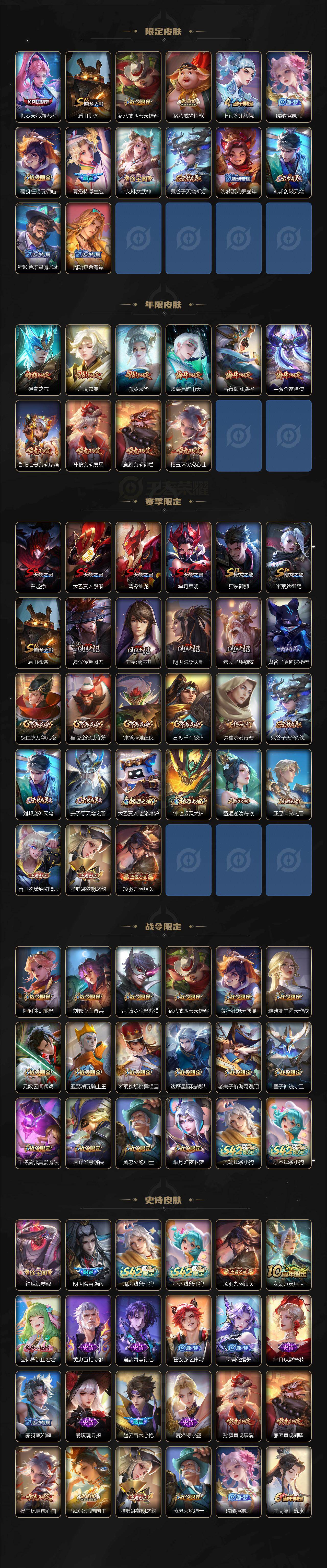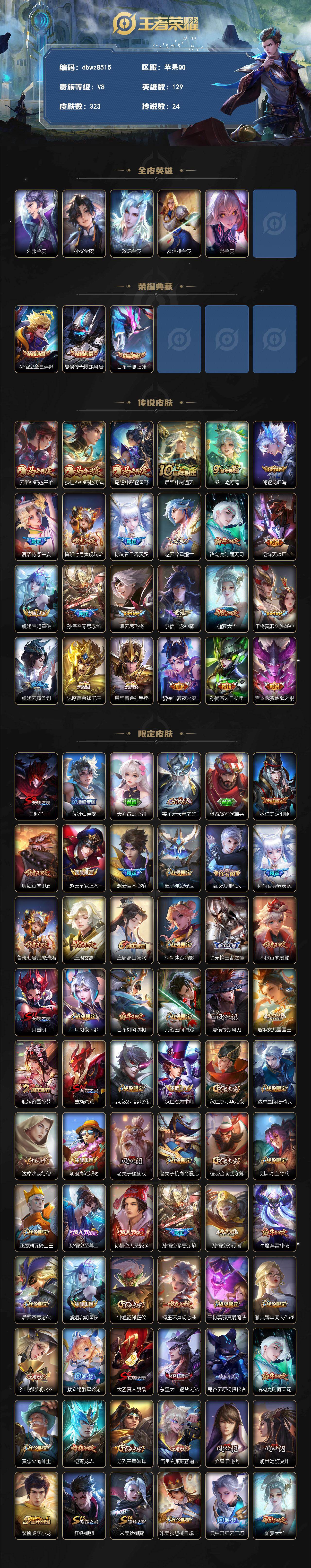 V8-最强王者段位-129英雄-323皮肤-3典藏皮肤-24传说-95史诗