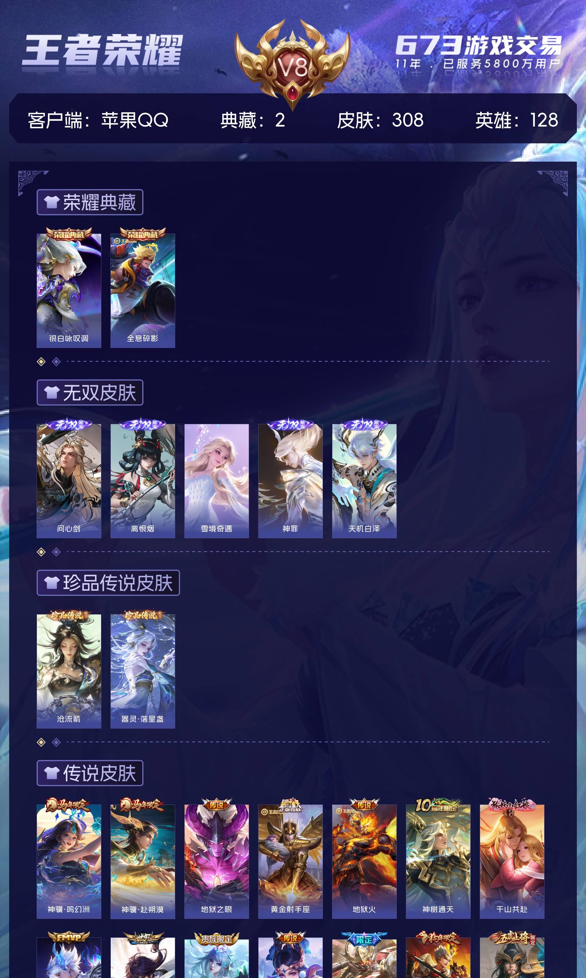 V8 皮肤308 英雄128 尊贵铂金 荣耀典藏2 无双皮肤5 珍品传说2 星传说4 传说17