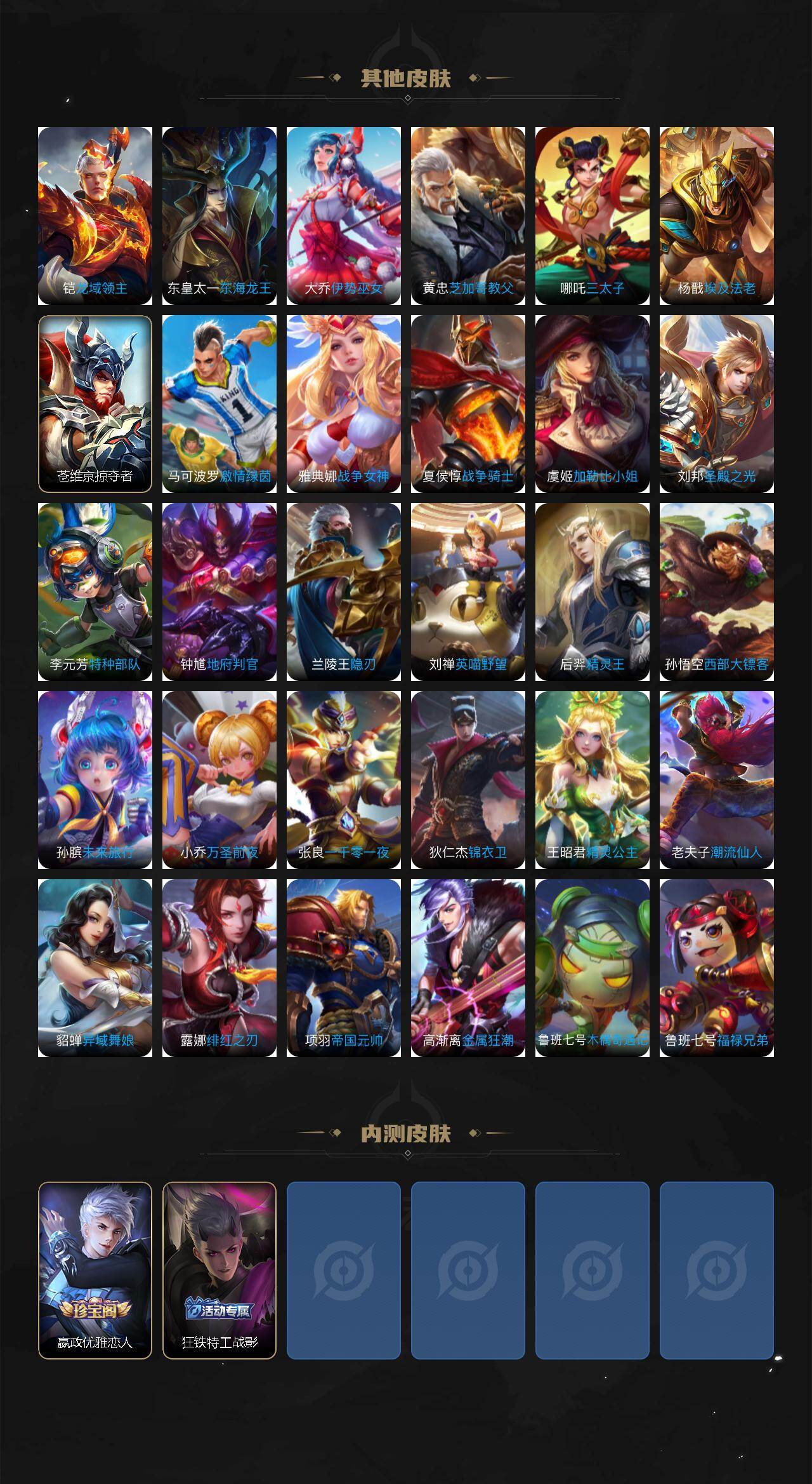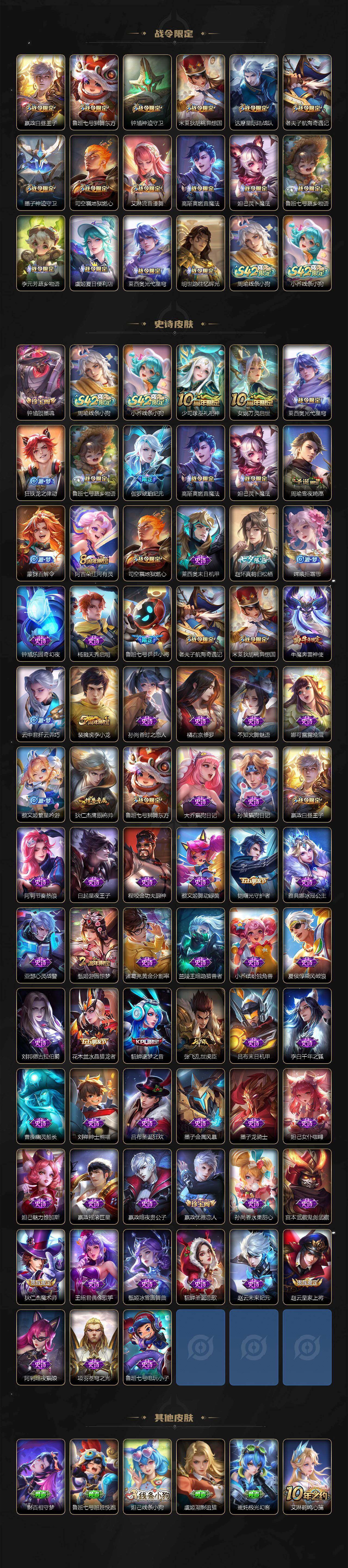 【传说皮肤】:嬴政玄雷天君,桑启鸣野蒿,亚连落雪白狼,澜逐花归海,露娜霜月吟,鲁班七号时之奇旅,吕布遇见神鼓,宫本武藏惊梅引,曜云鹰飞将,李信一念神魔,宫本武藏地狱之眼,孙悟空地狱火