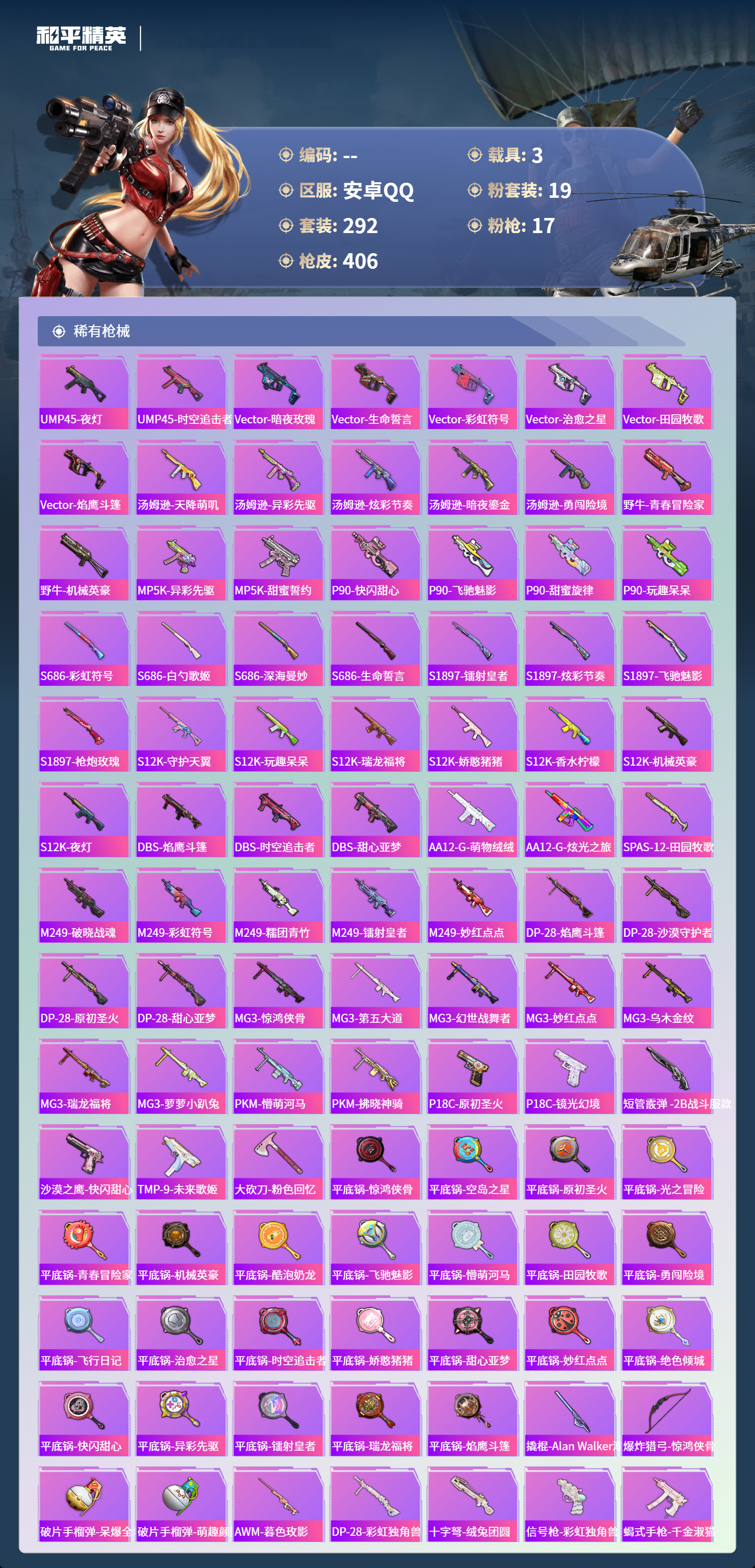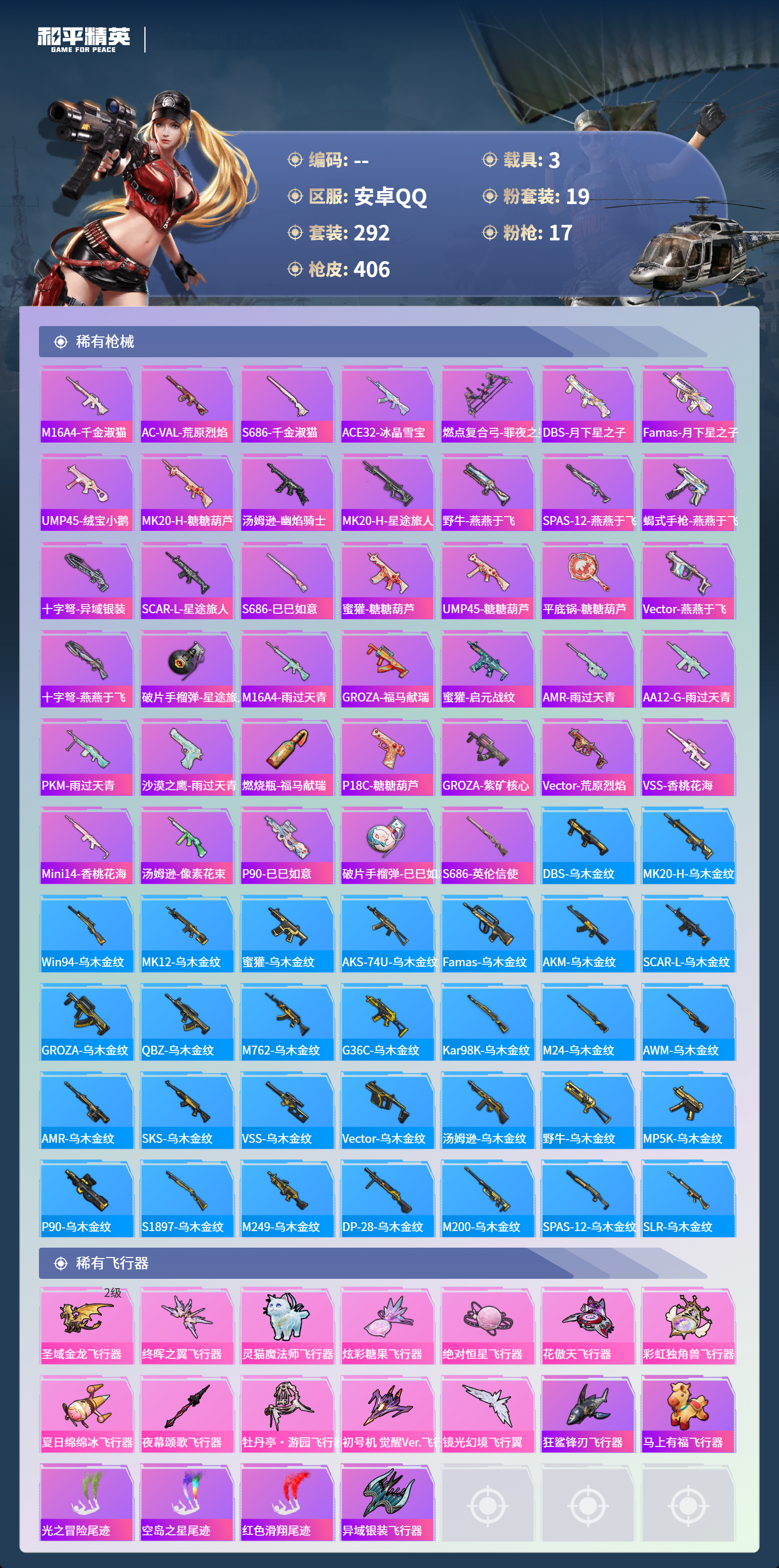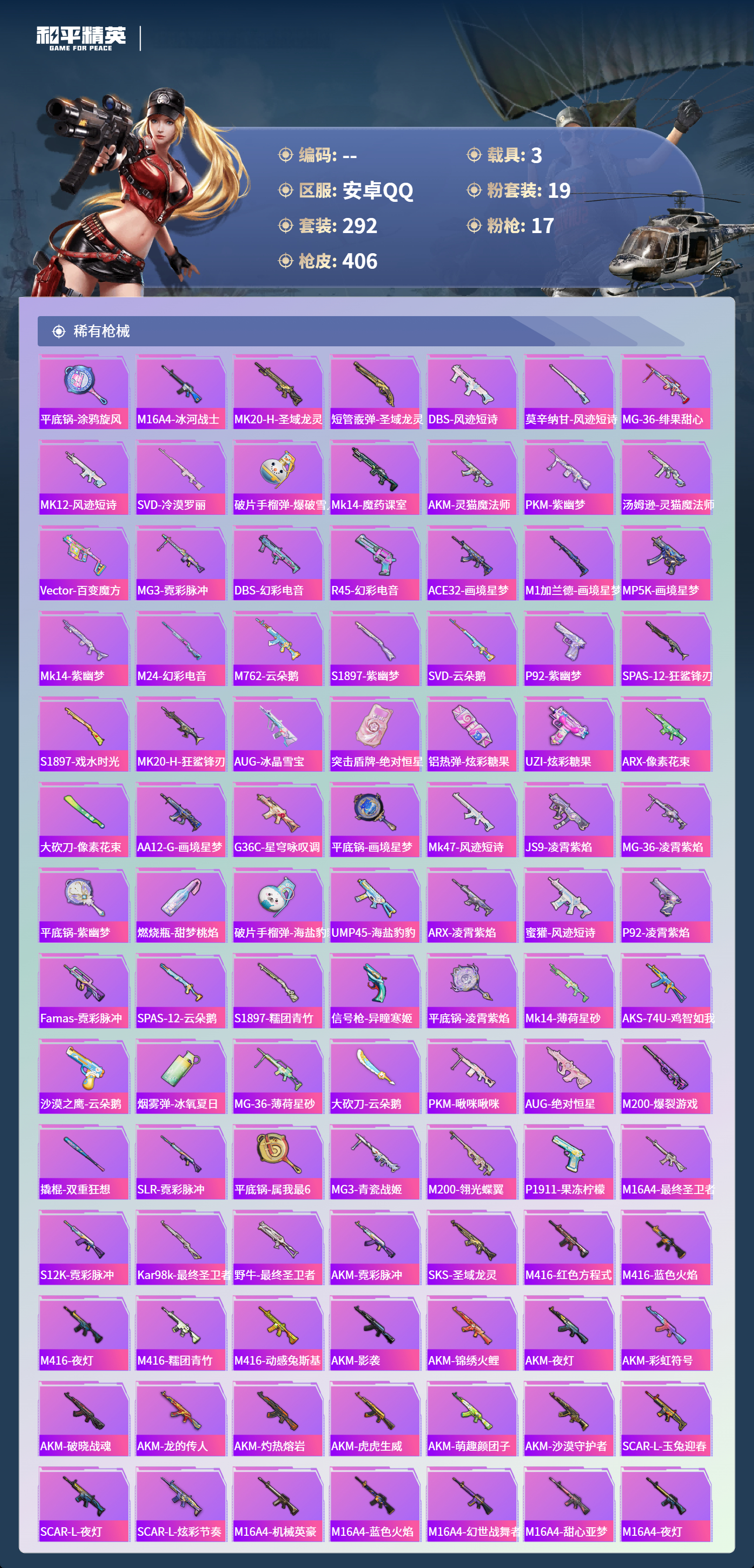 hs68038安卓手Q-13王牌印记-2红装-19粉装-17特效枪-3载具-热力值-292套装-406枪皮