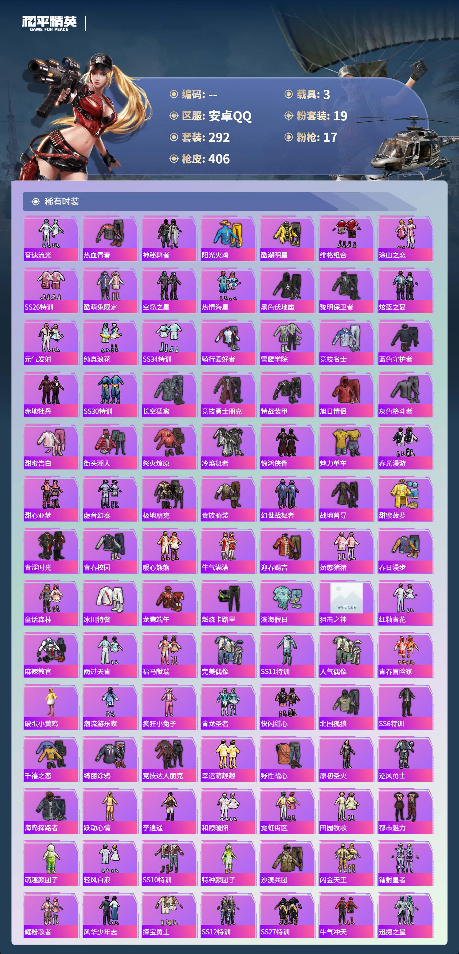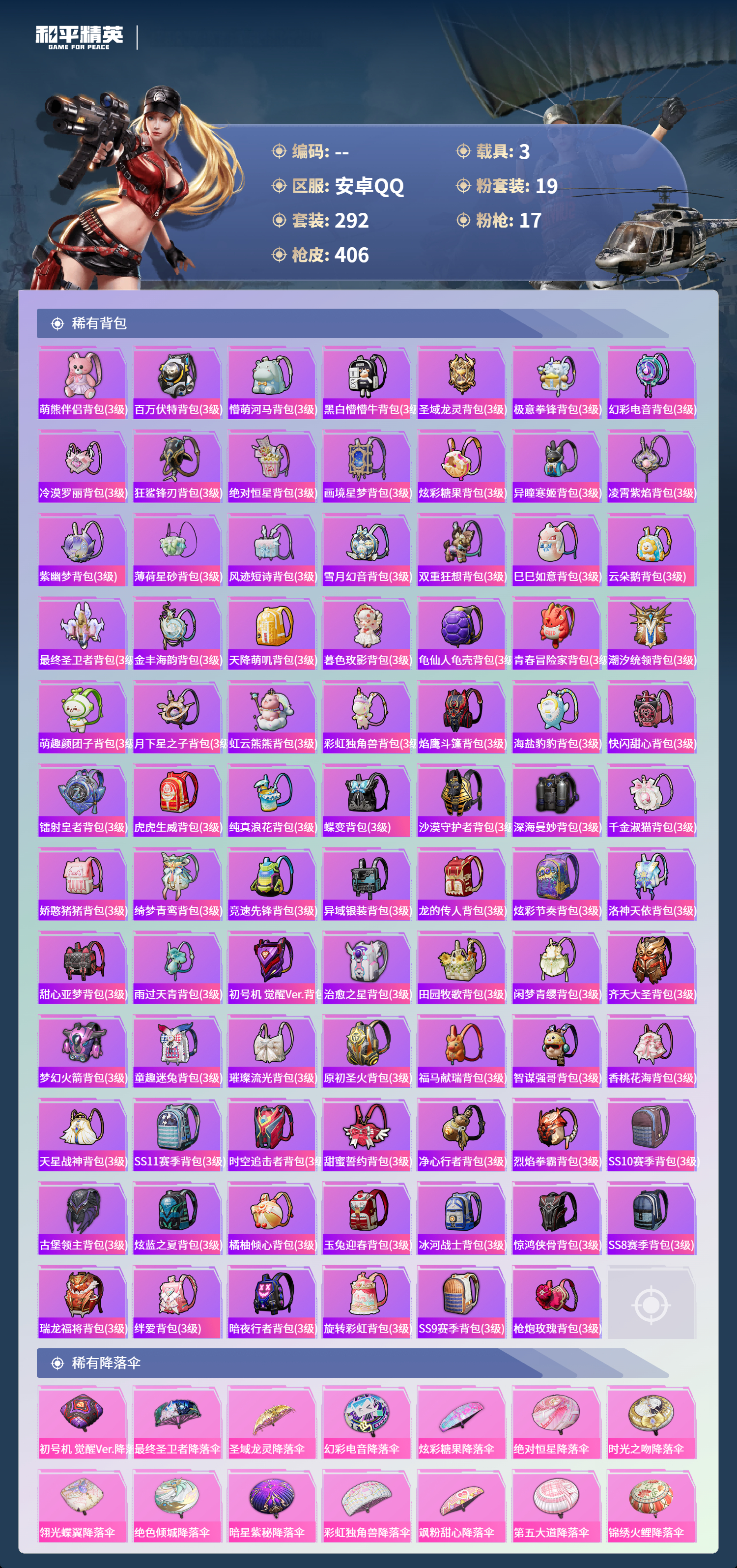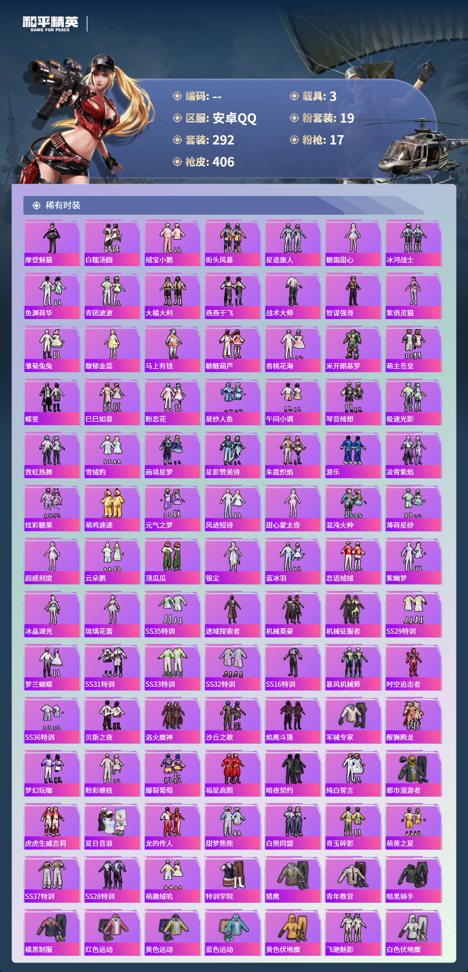 hs68038安卓手Q-13王牌印记-2红装-19粉装-17特效枪-3载具-热力值-292套装-406枪皮