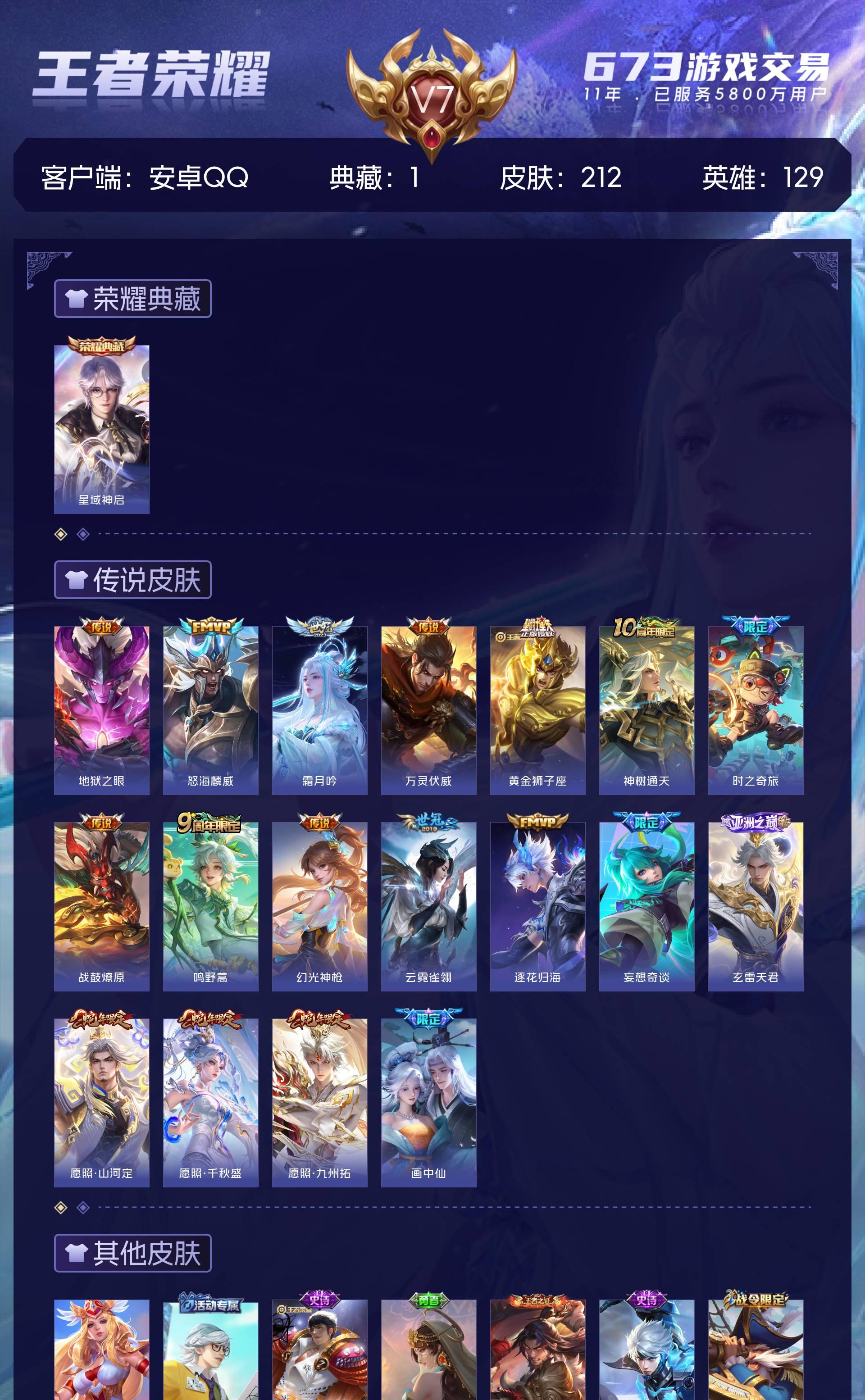 V7 皮肤212 英雄129 至尊星耀 荣耀典藏1 星传说1 传说19
