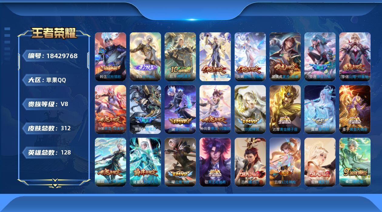 V8 1典藏 1无双 33传说 128英雄 312皮肤 可修改实名 男号