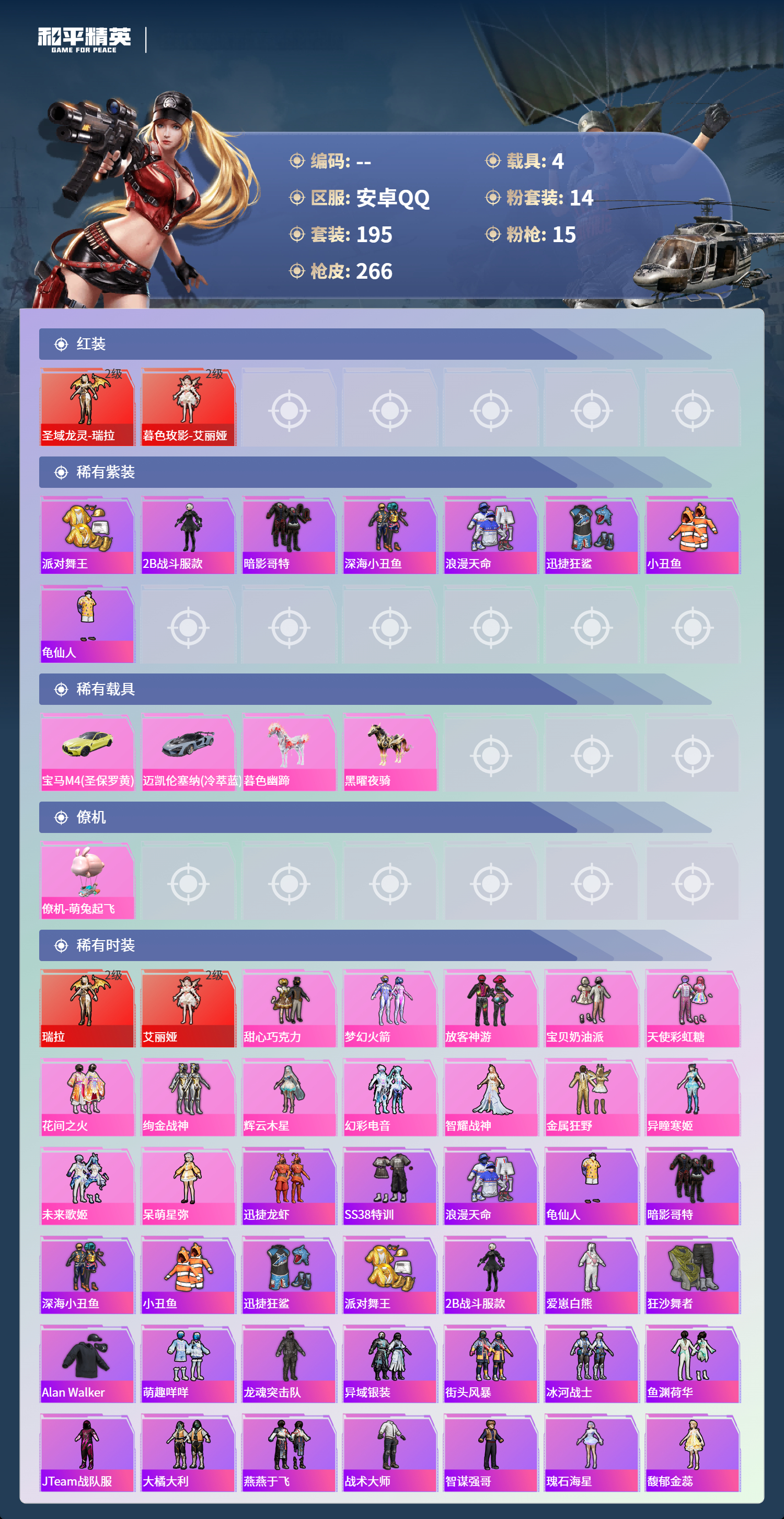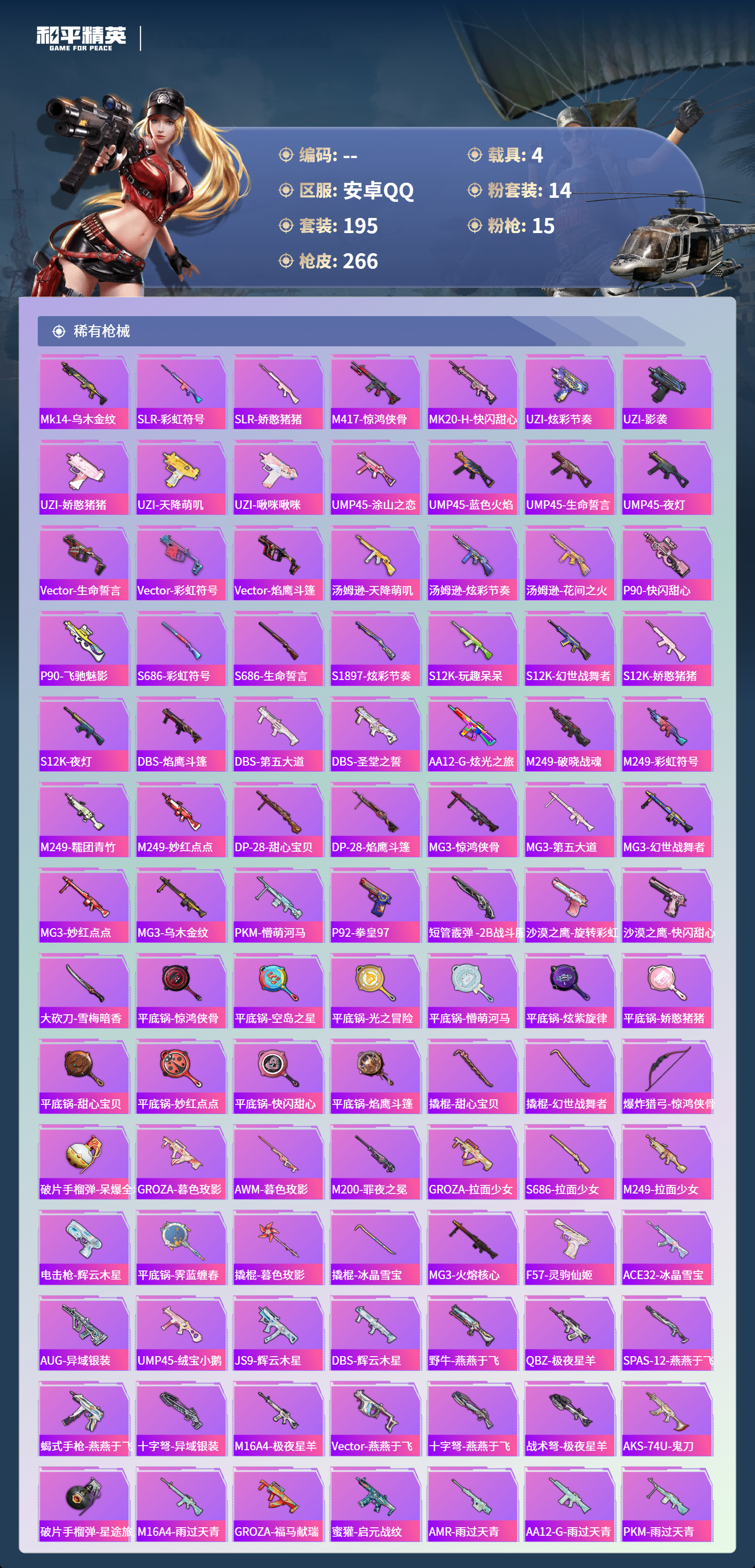 hs68076安卓手Q-14王牌印记-2红装-14粉装-15特效枪-4载具-90259热力值-195套装-266枪皮-2卓越印记-1传奇印记