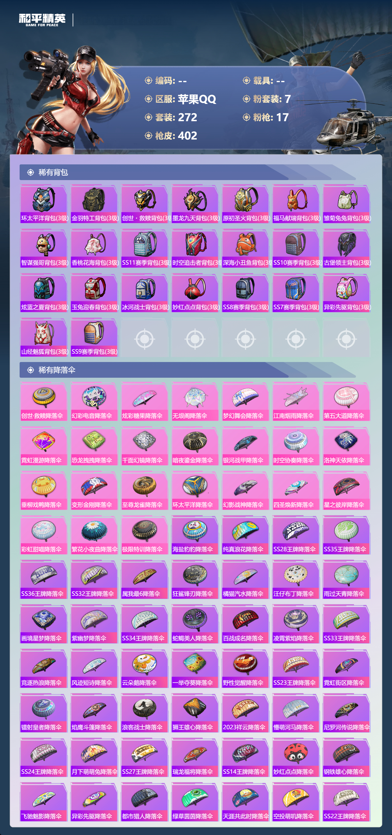 苹果手Q-22王牌印记-7粉装-17特效枪-热力值-272套装-402枪皮-2卓