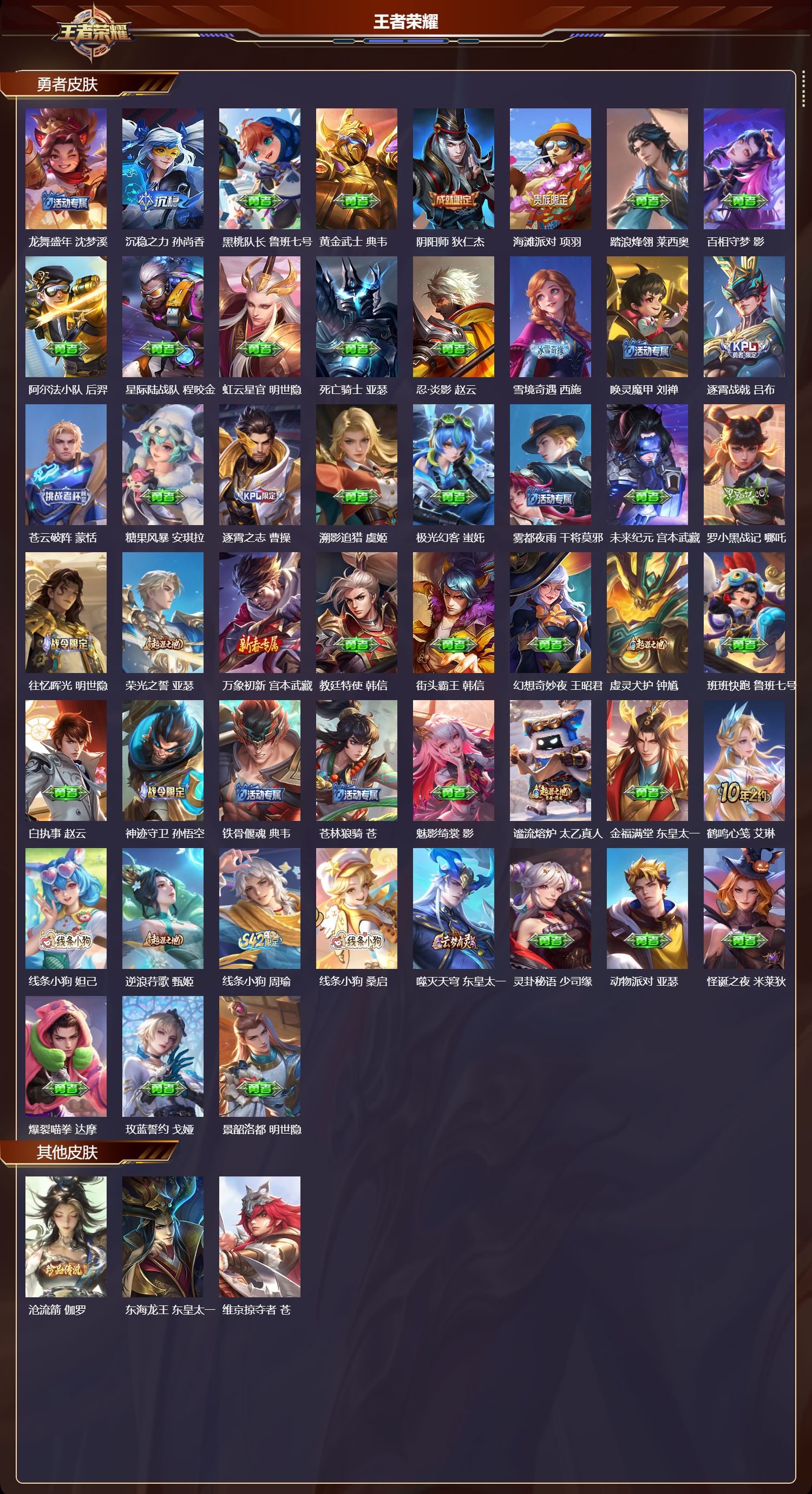至圣王者/122皮肤/115英雄/0典藏/0珍品无双/2无双/1珍品传说/21传说/45史诗/8稀有英雄
