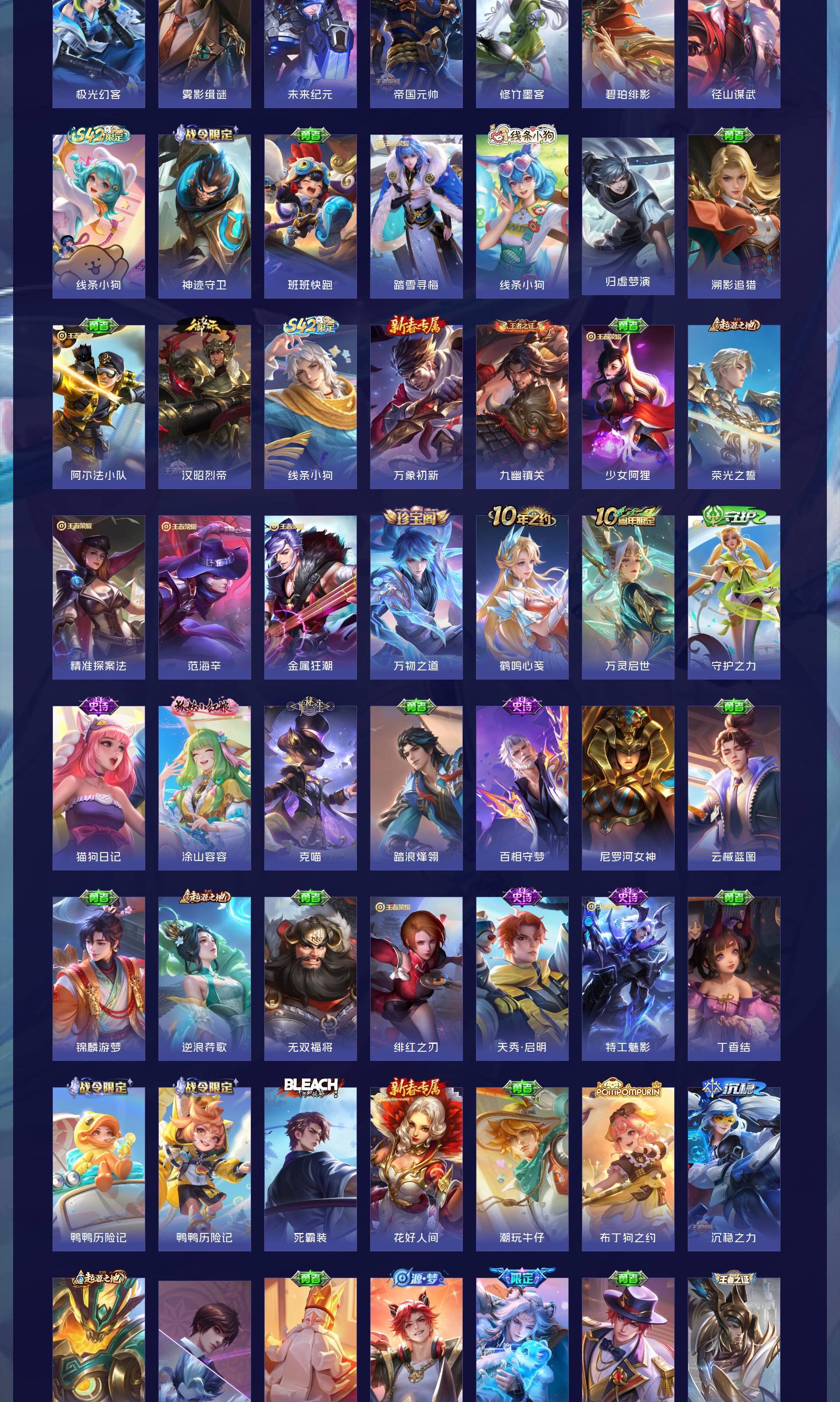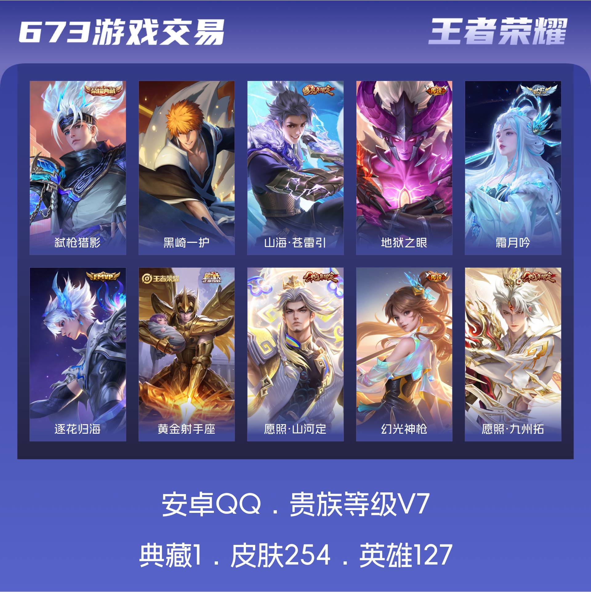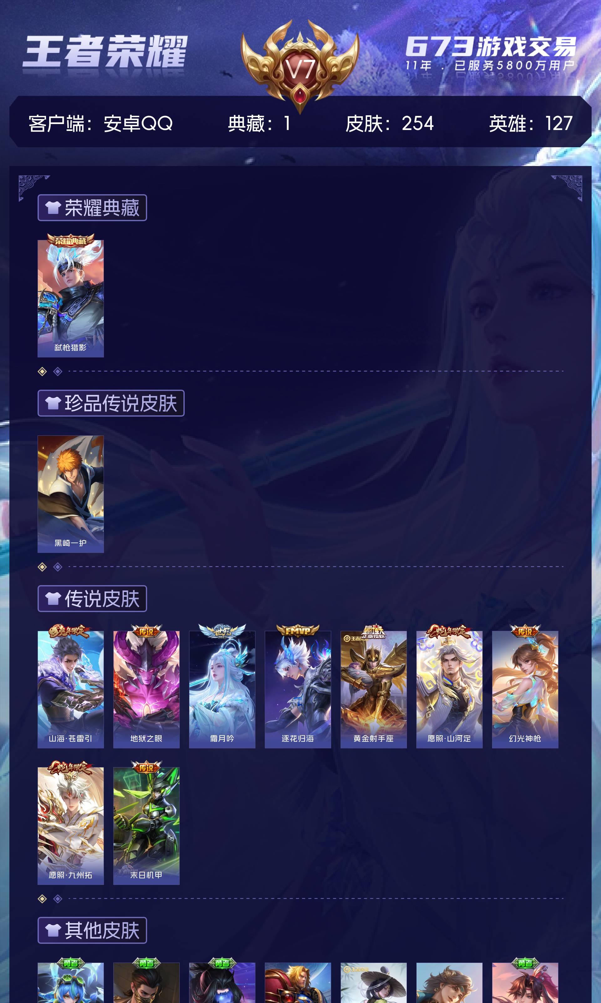 V7 皮肤254 英雄127 永恒钻石 荣耀典藏1 珍品传说1 星传说3 传说9