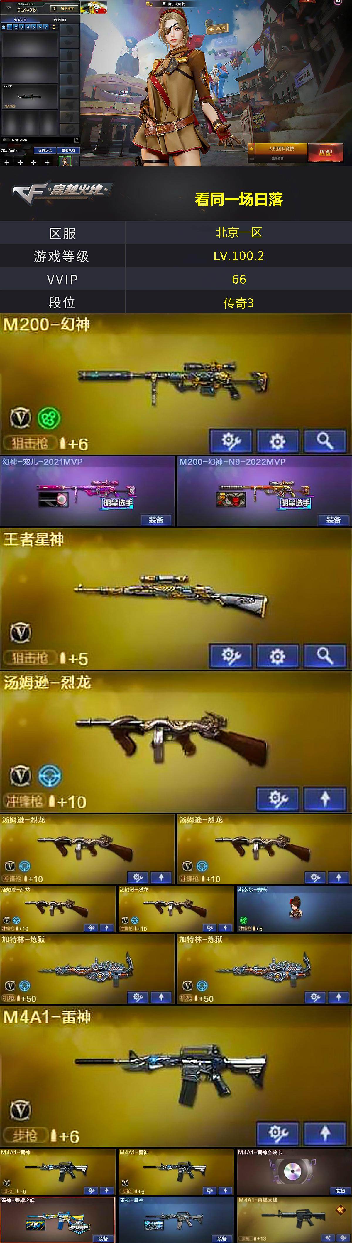 【ky6343】北京一区-68V-2王者武器数-1炫金武器数【热门武器】:M4A1-青龙,M200-幻神,死亡之眼,M4A1-黑骑士,汤姆逊-烈龙*5,加特林-炼狱*2,斯泰尔-蝴蝶,羊驼玩偶,沙鹰-修罗*2【王者炫金武器】:炫金毁灭【音效卡】:AK47-火麒麟音效卡,M4A1-雷神音效卡,M4A1-黑骑士音效卡,Barrett-毁灭音效卡,死神-雪域霜狐-怀旧音效卡【皮肤】:幻神-宠儿-2021MVP,M200-幻神-N9-2022MVP,雷神-荣耀之魄,雷神-星空,M4A1-再燃火线,火麒麟