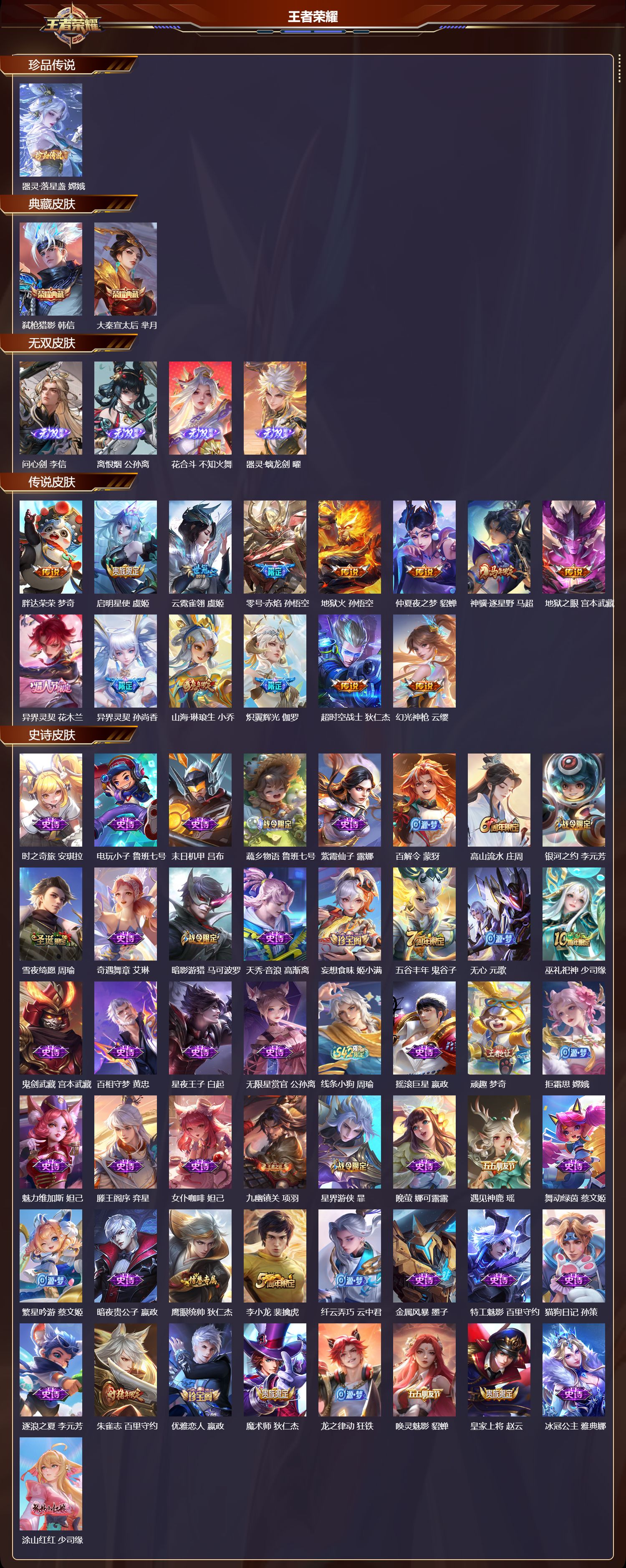 安卓QQ/至圣王者/298皮肤/128英雄/2典藏/0珍品无双/4无双/1珍品传说/14传说/84史诗/9稀有英雄【1 珍品传说】器灵·落星盏 嫦娥,【2 典藏皮肤】弑枪猎影 韩信,大秦宣太后 芈月,【4 无双皮肤】问心剑 李信,离恨烟 公孙离,花合斗 不知火舞,器灵·螭龙剑 曜,【14 传说皮肤】胖达荣荣 梦奇,启明星使 虞姬,云霓雀翎 虞姬,零号·赤焰 孙悟空,地狱火 孙悟空,仲夏夜之梦 貂蝉