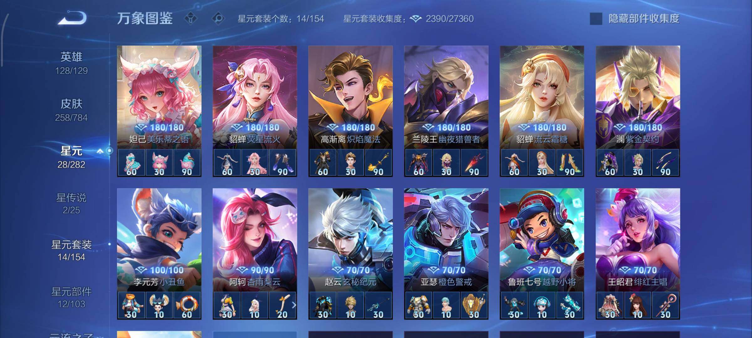 精品推荐·鸣剑曳影·星域神启·神骥逐星野·愿照山河定·愿照九州拓·愿照岁时盈·铠琥珀纪元·逐花归海·可二次】YXw21617-安卓WX-128英雄-258皮肤-7王者印记-140铭文-贵族积分6w【贵族8】【2典藏·2星传说·25传说·1天幕·21按键】【因赛季更新游戏段付以上号为准!】