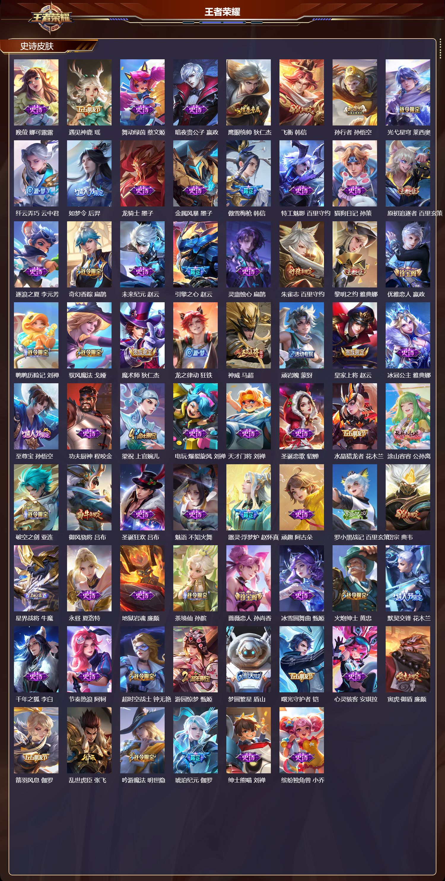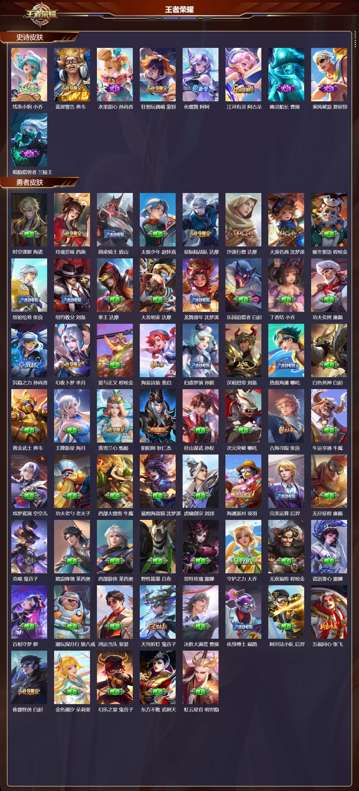 安卓QQ/无双王者/359皮肤/128英雄/2典藏/0珍品无双/2无双/3珍品传说/26传说/116史诗/9稀有英雄【3 珍品传说】沧流箭 伽罗,大耳狗之梦 瑶,器灵·落星盏 嫦娥,【2 典藏皮肤】鸣剑·曳影 李白,银白咏叹调 铠,【2 无双皮肤】神罪 铠,器灵·螭龙剑 曜,【26 传说皮肤】武圣 关羽,启明星使 虞姬,无双飞将 马超,零号·赤焰 孙悟空,云鹰飞将 曜,深海之息 马可波罗,浮生妄