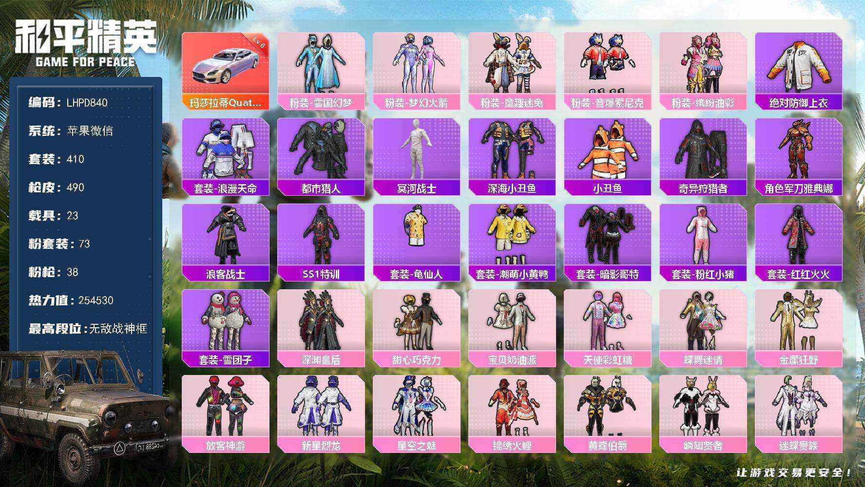 【店主推荐捡漏号!可直接换绑】苹果 微信-无敌战神框-73粉装-38特效枪-23载具-16粉色飞行器-254530热力值-26王牌印记-410套装-490枪皮【红色载具】:玛莎拉蒂Quattroporte(幻星粉)(六级)【热门品类】:粉装-雪国幻梦,粉装-梦幻火箭,粉装-童趣迷兔,粉装-音爆索尼克,粉装-缤纷油彩,绝对防御上衣,套装-浪漫天命,套装-都市猎人,套装-冥河战士,套装-深海小丑鱼,套装-小丑鱼,套装-奇异狩猎者,角色-军刀雅典娜,套装-浪客战士,套装-SS1特训,套装-龟仙人,套装