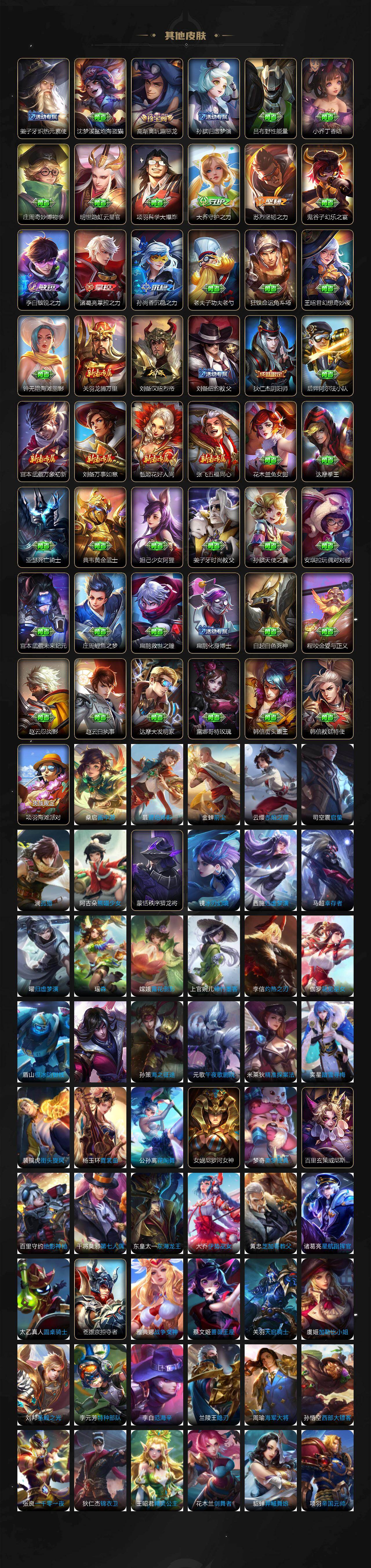 【限定皮肤】:虞姬夏日便利店,姜子牙天穹之誓,狄仁杰阴阳师,赵云皇家上将,嬴政优雅恋人,庄周高山流水,高渐离玩趣恶龙,芈月白晶晶,元歌云间偶戏,元歌无心,夏侯惇朔风刀,甄姬游园惊梦,典韦蓝屏警告,马可波