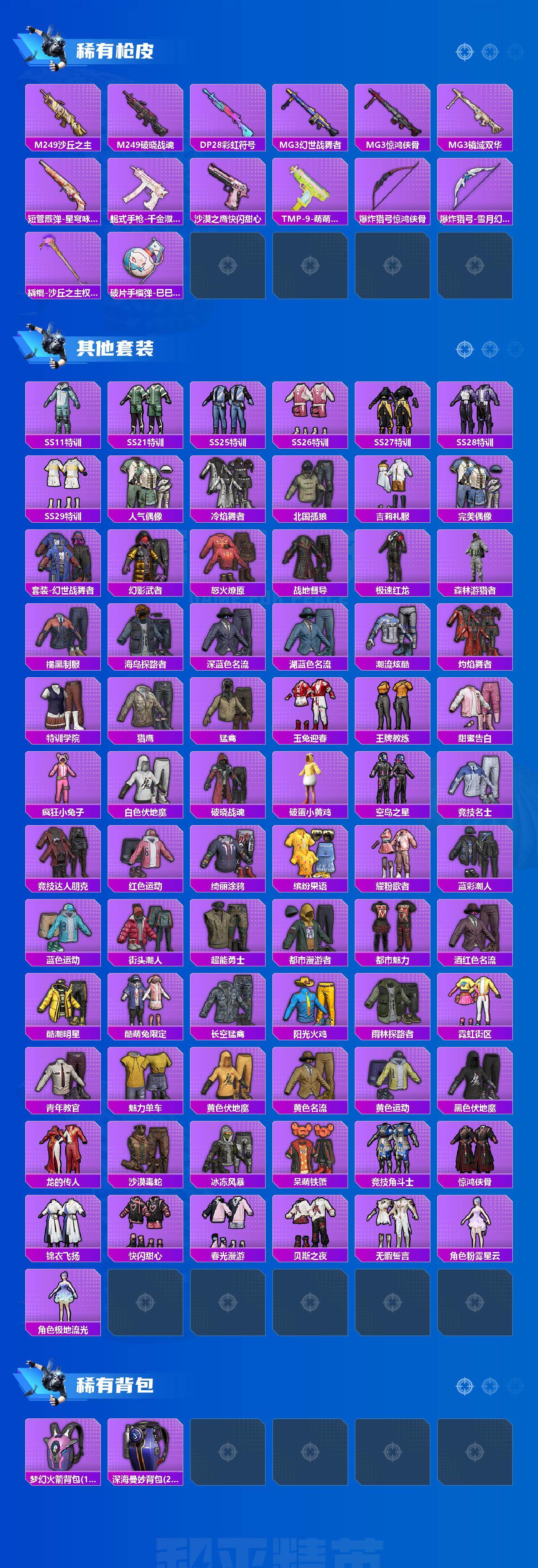 粉装3/粉枪6/载具1/珍稀飞行器130245,87700,72317,126488/套装127/枪皮144/热力值45801/历史最高段位:王牌印记9次/Lv:67/三级ACE32-萌骑漫游/三级UMP45-宇宙意志/五级Kar98K-巳巳如意/五级Mk14-福马献瑞/三级MK12-雪月幻音/五级DP-28-豹影疾电/千金淑猫/月影灵韵/角色-虹云熊熊/暮色幽蹄/ACE32-萌骑漫游/UMP45-宇宙意志/Kar98K-巳巳如意/Mk14-福马献瑞/MK12-雪月幻音/DP-28-豹影疾电/炫