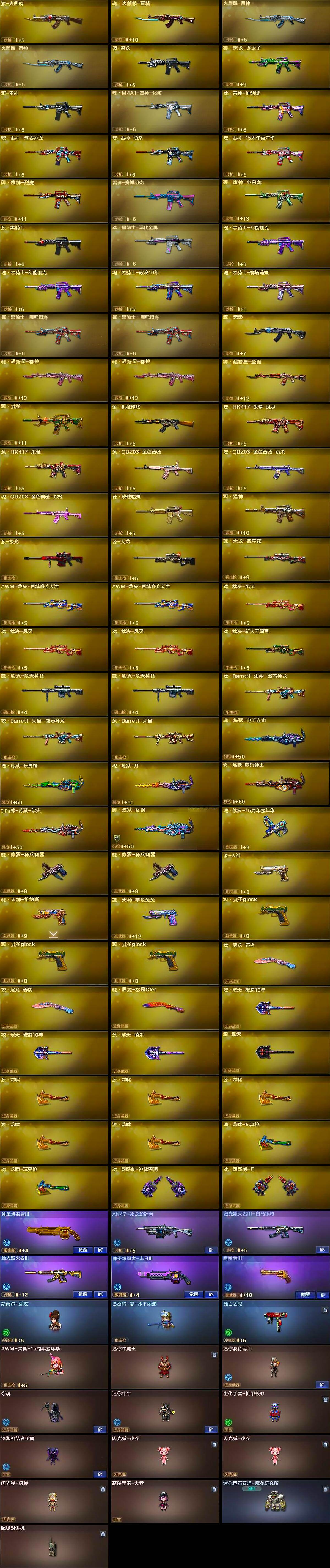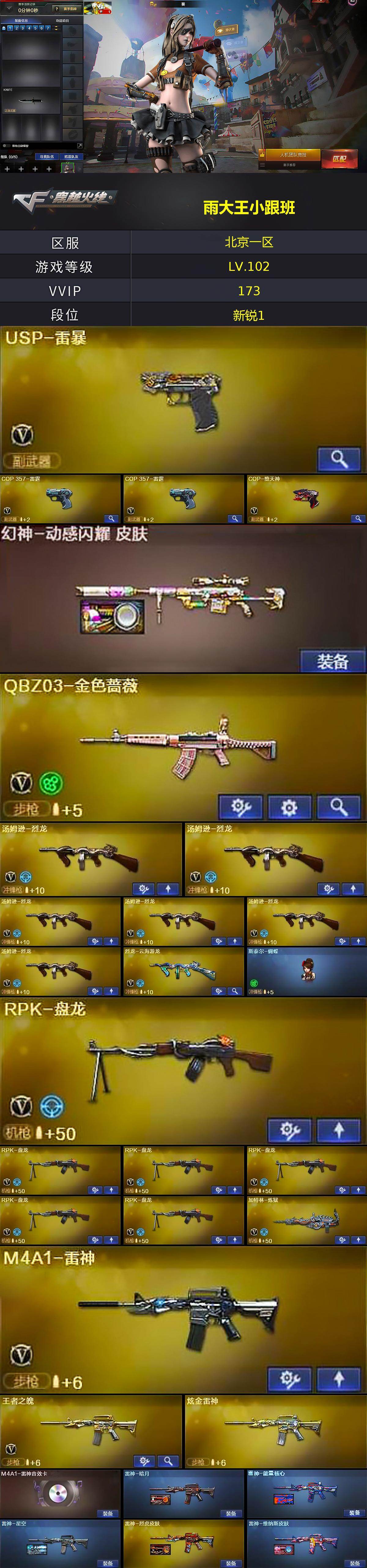 【热门武器】:QBZ03-金色蔷薇,死亡之眼,M4A1-黑骑士,汤姆逊-烈龙*6,RPK-盘龙*6,加特林-炼狱,斯泰尔-蝴蝶,USP-雷暴,COP-堕天神,沙鹰-修罗*4,金刚伞
