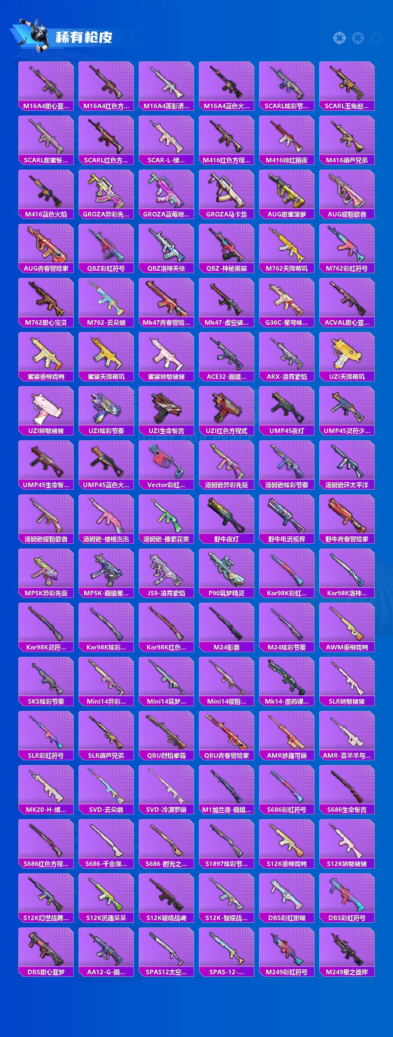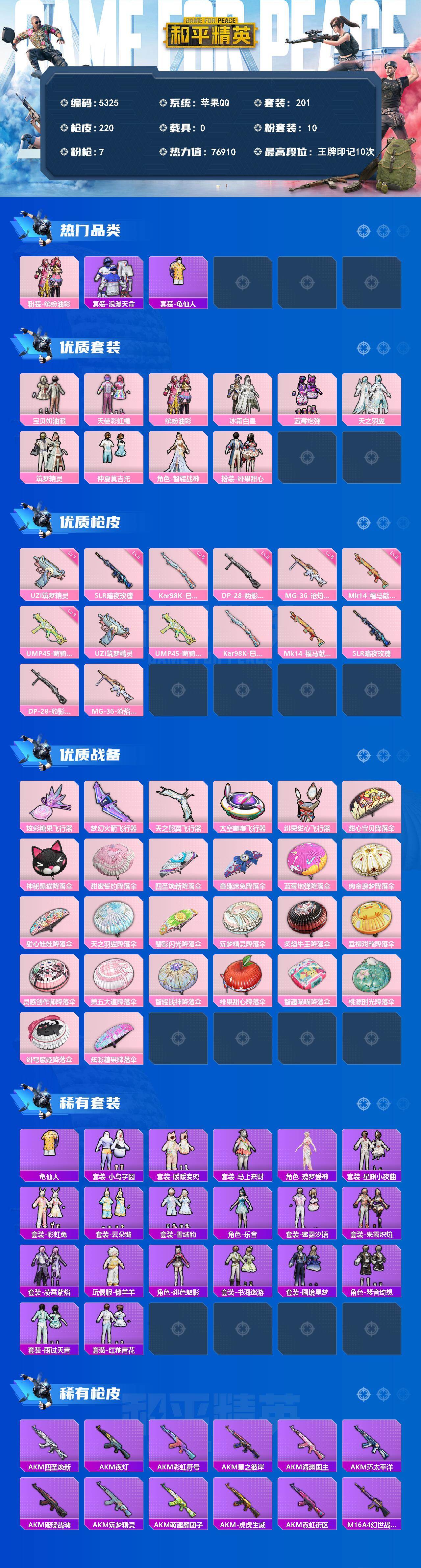 粉装10/粉枪7/珍稀飞行器130245,72237,72270,72273,103345/套装201/枪皮220/热力值76910/历史最高段位:王牌印记10次/Lv:64/七级UZI-筑梦精灵/三级UMP45-萌骑冒险/五级Kar98K-巳巳如意/五级Mk14-福马献瑞/六级SLR-暗夜玫瑰/五级DP-28-豹影疾电/五级MG-36-沧焰双生/粉装-缤纷油彩/套装-浪漫天命/套装-龟仙人/宝贝奶油派/天使彩虹糖/缤纷油彩/冰霜白皇/蓝莓炮弹/天之羽翼/筑梦精灵/仲夏莫吉托/角色-智耀战神/粉
