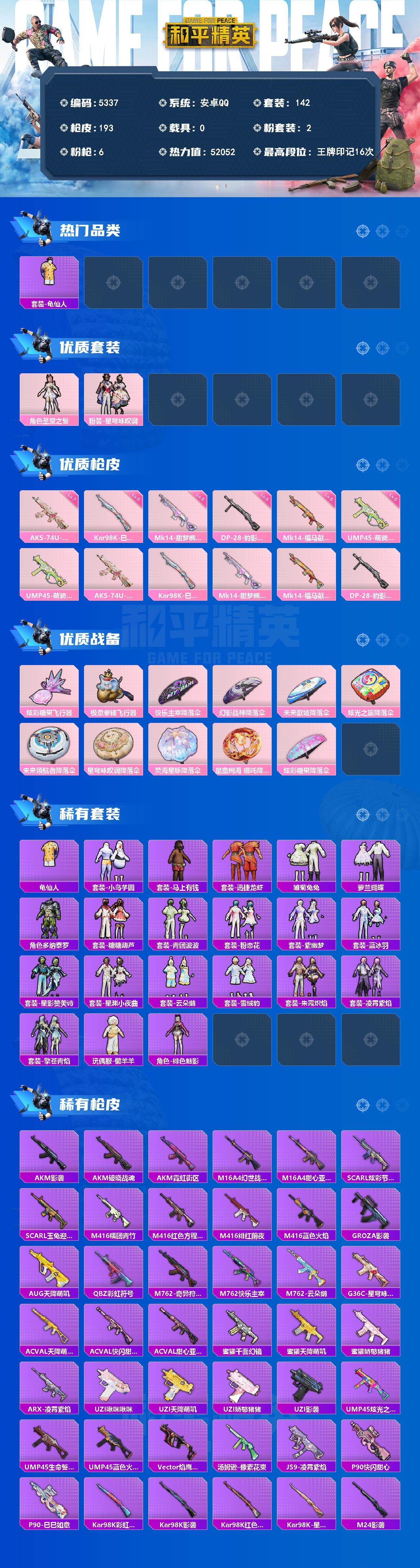142套装/枪械6/装备211/战备123/王牌印记16/热力值52052/五级
