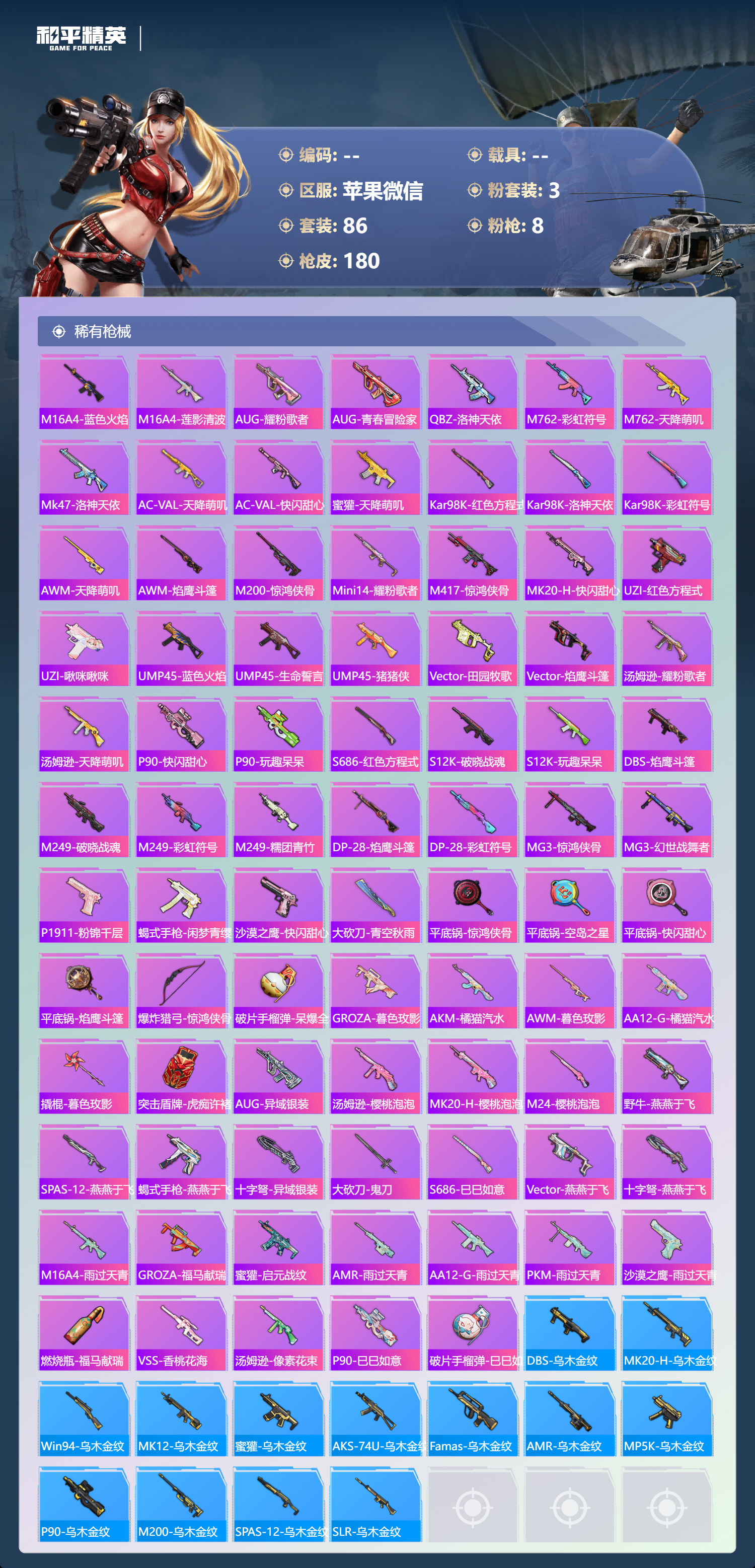 苹果微信-10王牌印记-3粉装-8特效枪-48881热力值-86套装-180枪皮
