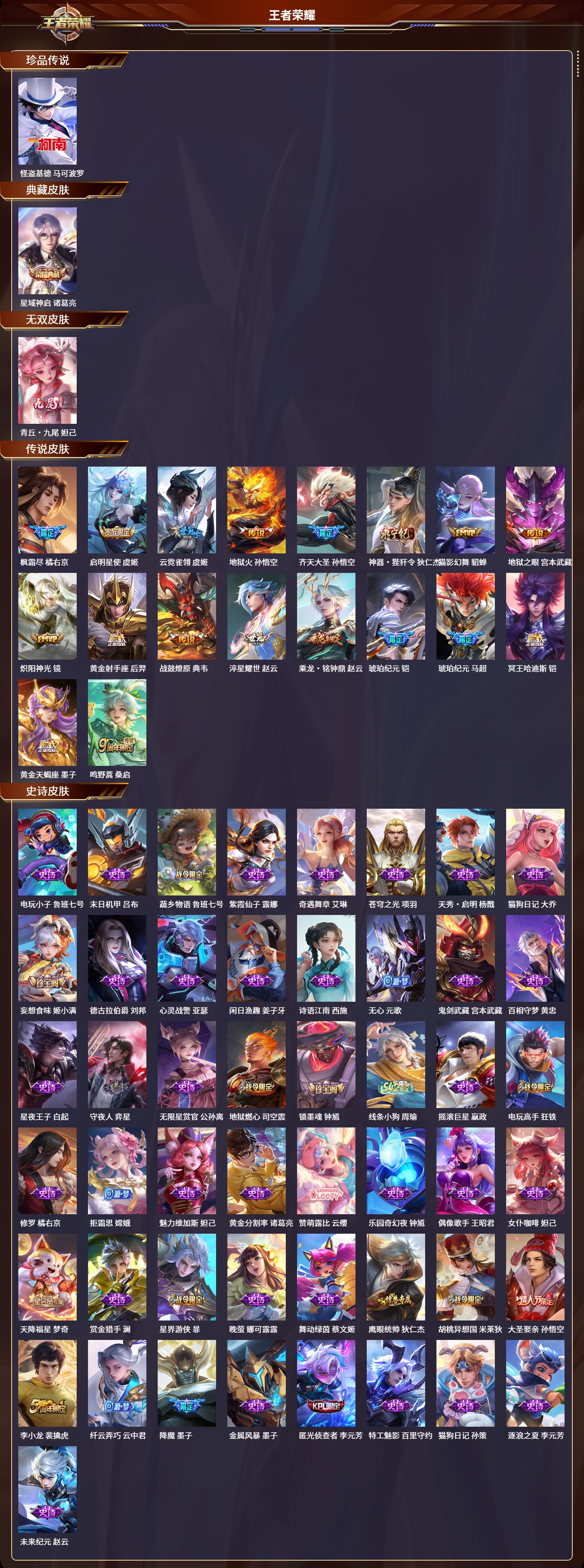 苹果QQ/无双王者/325皮肤/128英雄/1典藏/0珍品无双/1无双/1珍品传说/18传说/91史诗/9稀有英雄【1 珍品传说】怪盗基德 马可波罗,【1 典藏皮肤】星域神启 诸葛亮,【1 无双皮肤】青丘·九尾 妲己,【18 传说皮肤】枫霜尽 橘右京,启明星使 虞姬,云霓雀翎 虞姬,地狱火 孙悟空,齐天大圣 孙悟空,神器·狴犴令 狄仁杰,猫影幻舞 貂蝉,地狱之眼 宫本武藏,炽阳神光 镜,黄金射手座