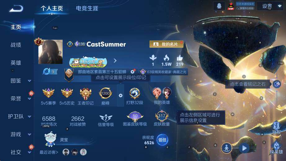 贵族等级7/荣耀典藏数量4/传说皮肤数量15/史诗皮肤数量83/皮肤数量317/英雄数量128/段位最强王者/孙权全皮/敖隐全皮/影全皮/全息碎影 孙悟空/鸣剑·曳影 李白/银白咏叹调 铠/幻阙歌 貂蝉/离恨烟 公孙离/伽罗沧流箭/器灵·落星盏 嫦娥/阿轲罗刹妄海/貂蝉神骥聚万邦/马超神骥逐星野/神树通天 后羿/幻光神枪 云缨/鸣野蒿 桑启/乘龙·问璇玑 孙尚香/逐花归海 澜/霜月吟 露娜/炽