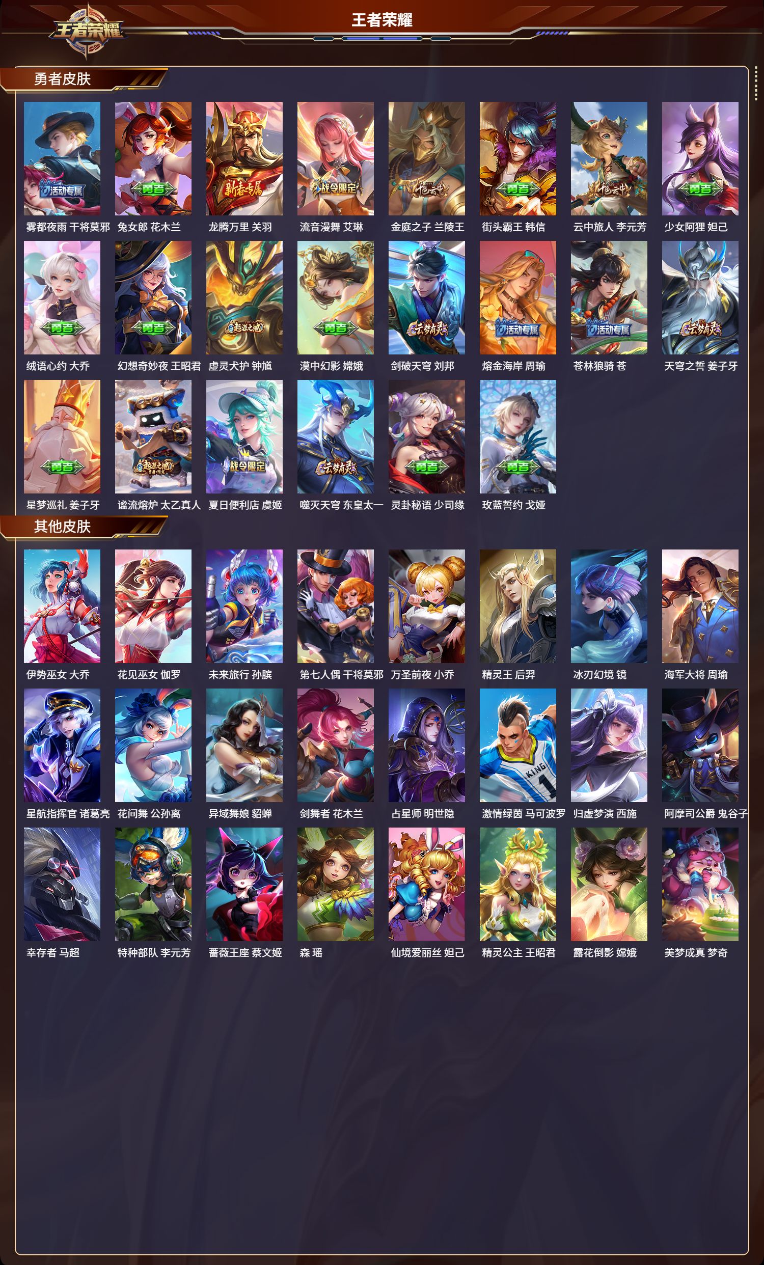 安卓QQ/精品女号/情限瑶/四千星币/荣耀黄金/116皮肤/118英雄/1典藏/3传说/39史诗/7稀有英雄【1 典藏皮肤】天鹅之梦 小乔,【3 传说皮肤】时之祈愿 瑶,愿照·众生和 妲己,鸣野蒿 桑启,【39 史诗皮肤】时之奇旅 安琪拉,紫霞仙子 露娜,猫狗日记 大乔,德古拉伯爵 刘邦,五谷丰年 鬼谷子,诗语江南 西施,无心 元歌,鬼剑武藏 宫本武藏,星夜王子 白起,顽趣 梦奇,魅力维加斯