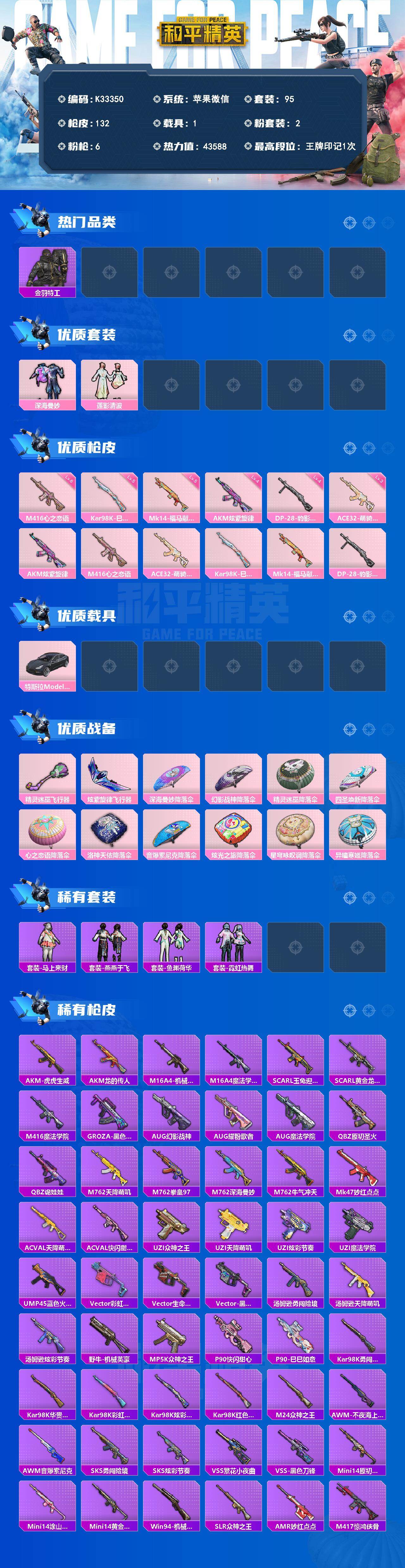 苹果 微信-2粉装-6特效枪-1载具-2粉色飞行器-43588热力值-1王牌印记-95套装-132枪皮