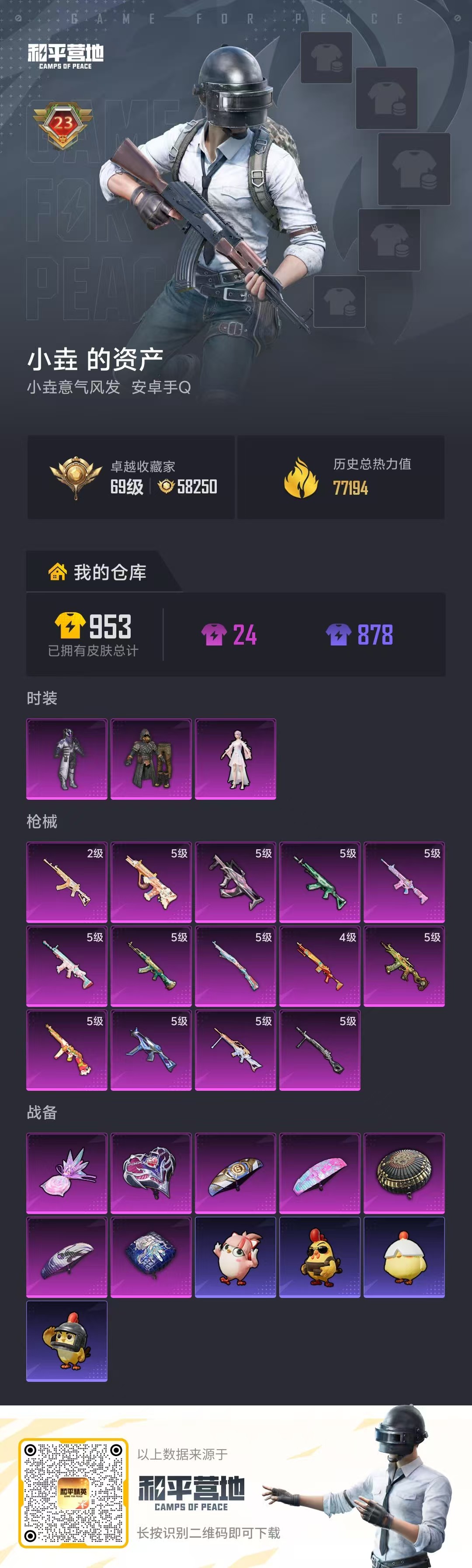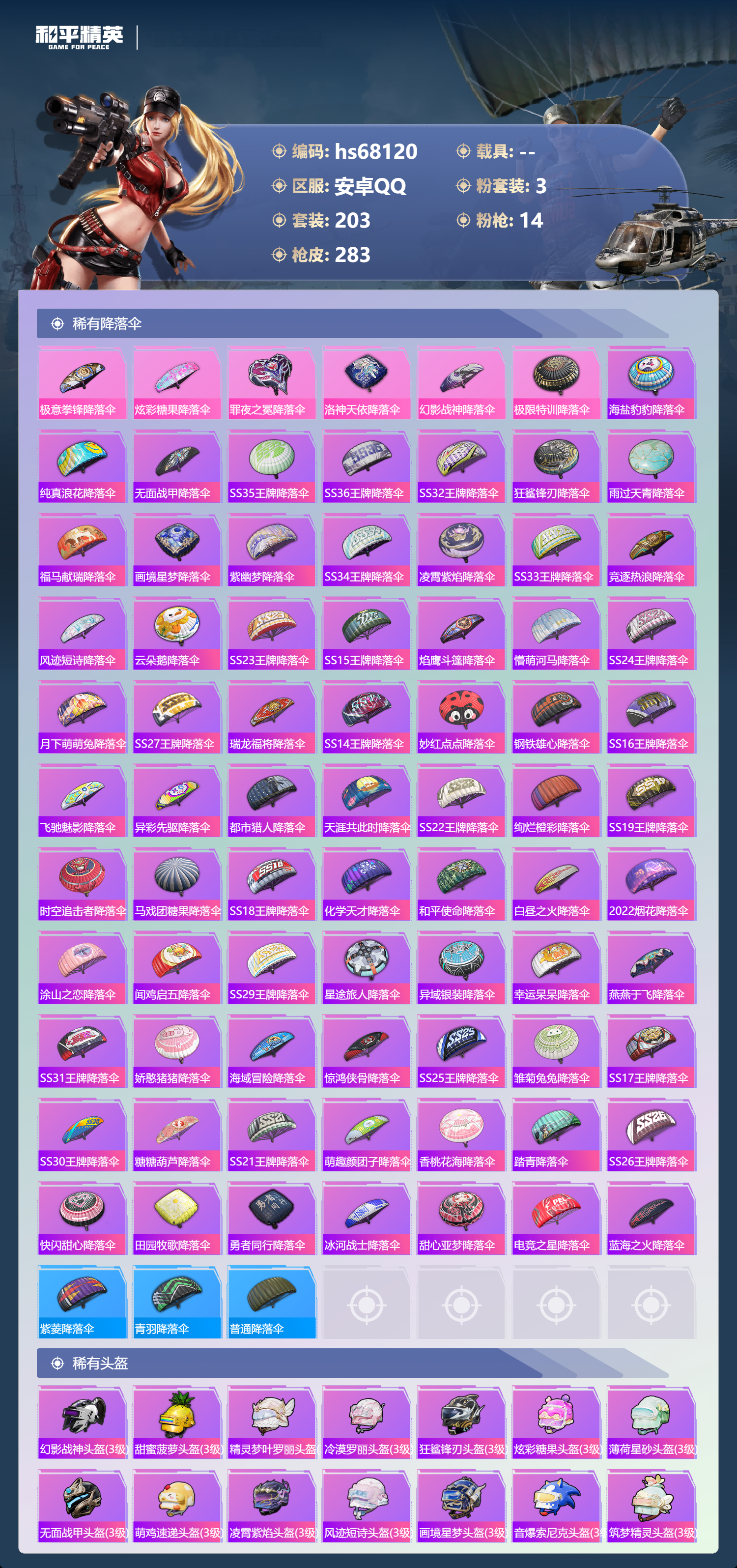 hs68120 安卓手Q-23王牌印记-有战神框-3粉装-14特效枪-77194热力值-203套装-283枪皮