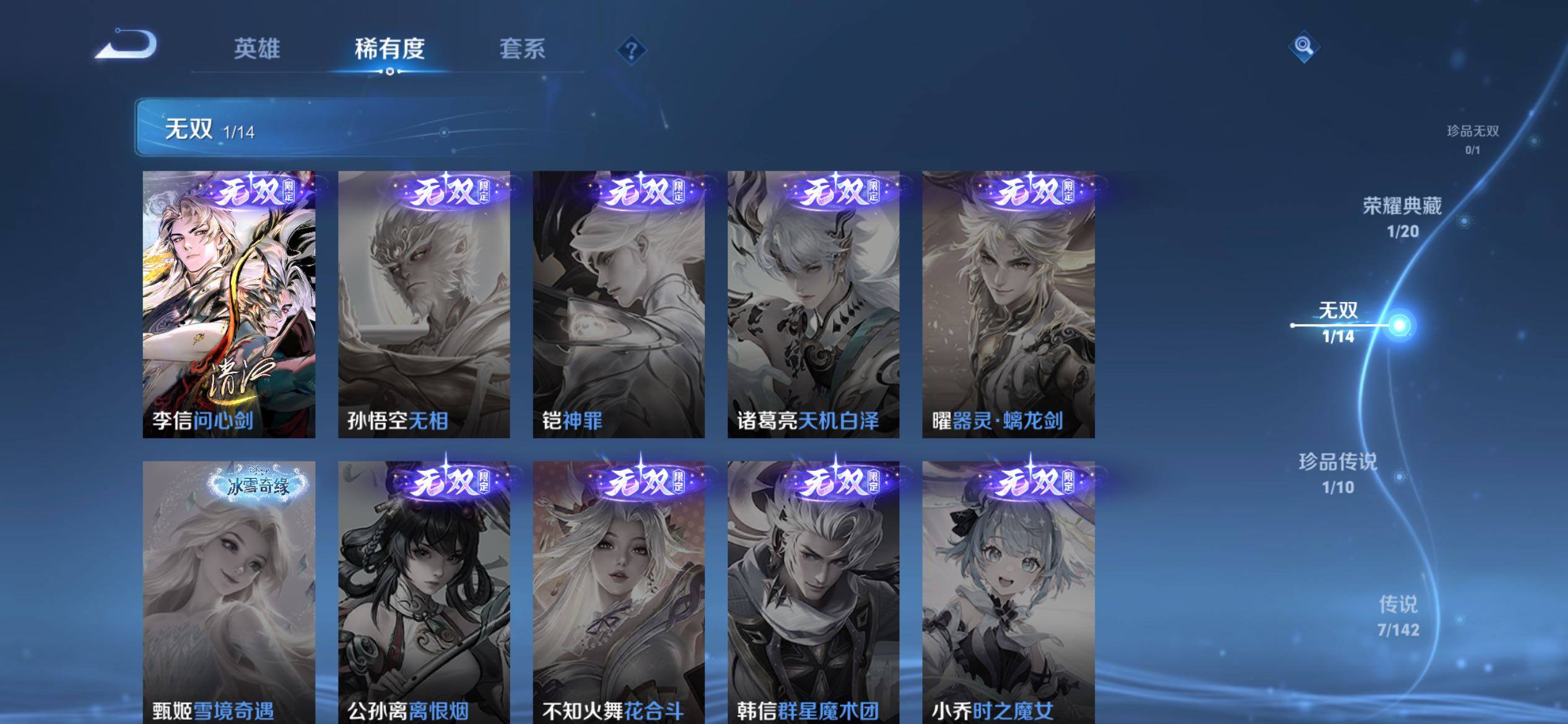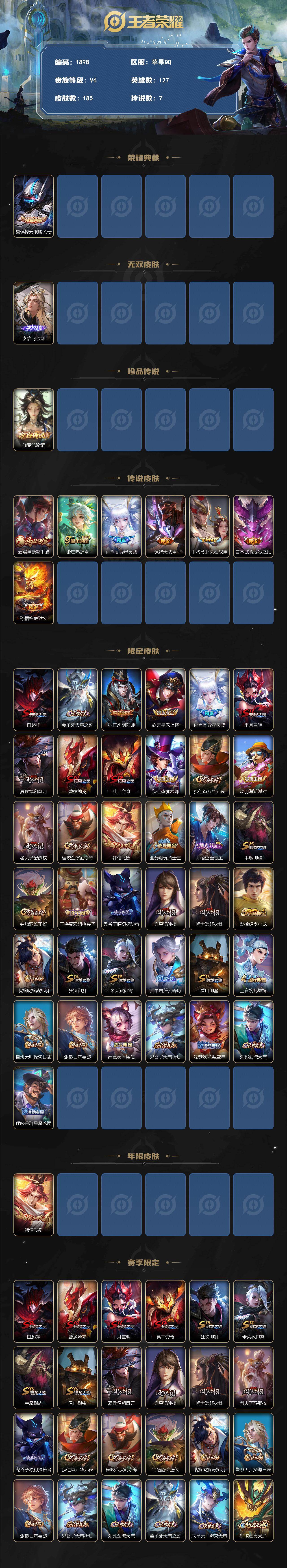 【185皮肤7传说1无双1珍品传说 李信问心剑 伽罗沧流箭 云缨神骥越千峰 至尊宝】苹果Q-V6-最强王者段位-127英雄-185皮肤-1典藏皮肤-1无双-1珍品传说-7传说-34史诗